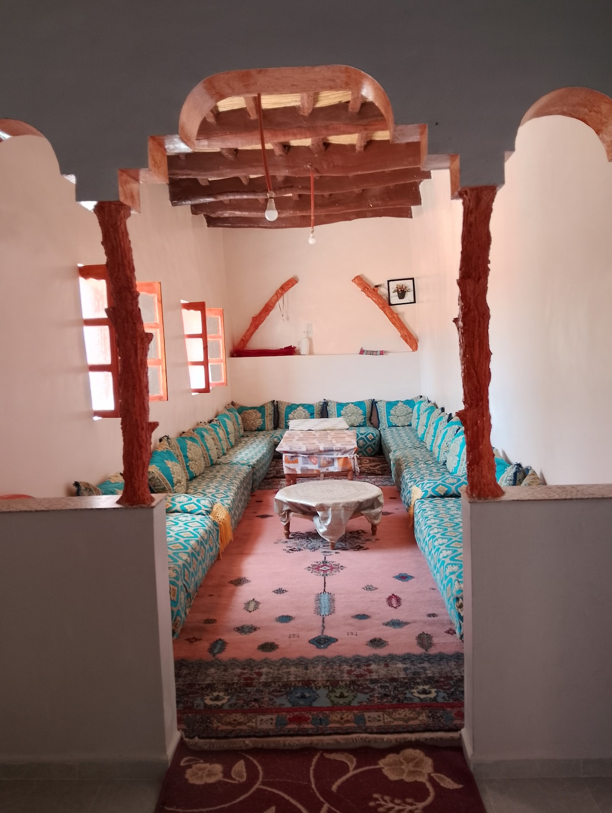 Nuestra Kasbah es un antiguo edificio tradicional hecho de adobe, paja, bambú, madera de eucalipto y hierro forjado. Estos materiales aíslan naturalmente la temperatura interior: se mantienen frescos en verano y cálidos durante el invierno. Después de un año y cuatro meses de arduo trabajo, la Kasbah ahora está completamente renovada y tiene un auténtico toque increíble. Consta de ocho habitaciones, un restaurante y terrazas de árboles conectadas por un puente de madera que te permite admirar el impresionante paisaje.