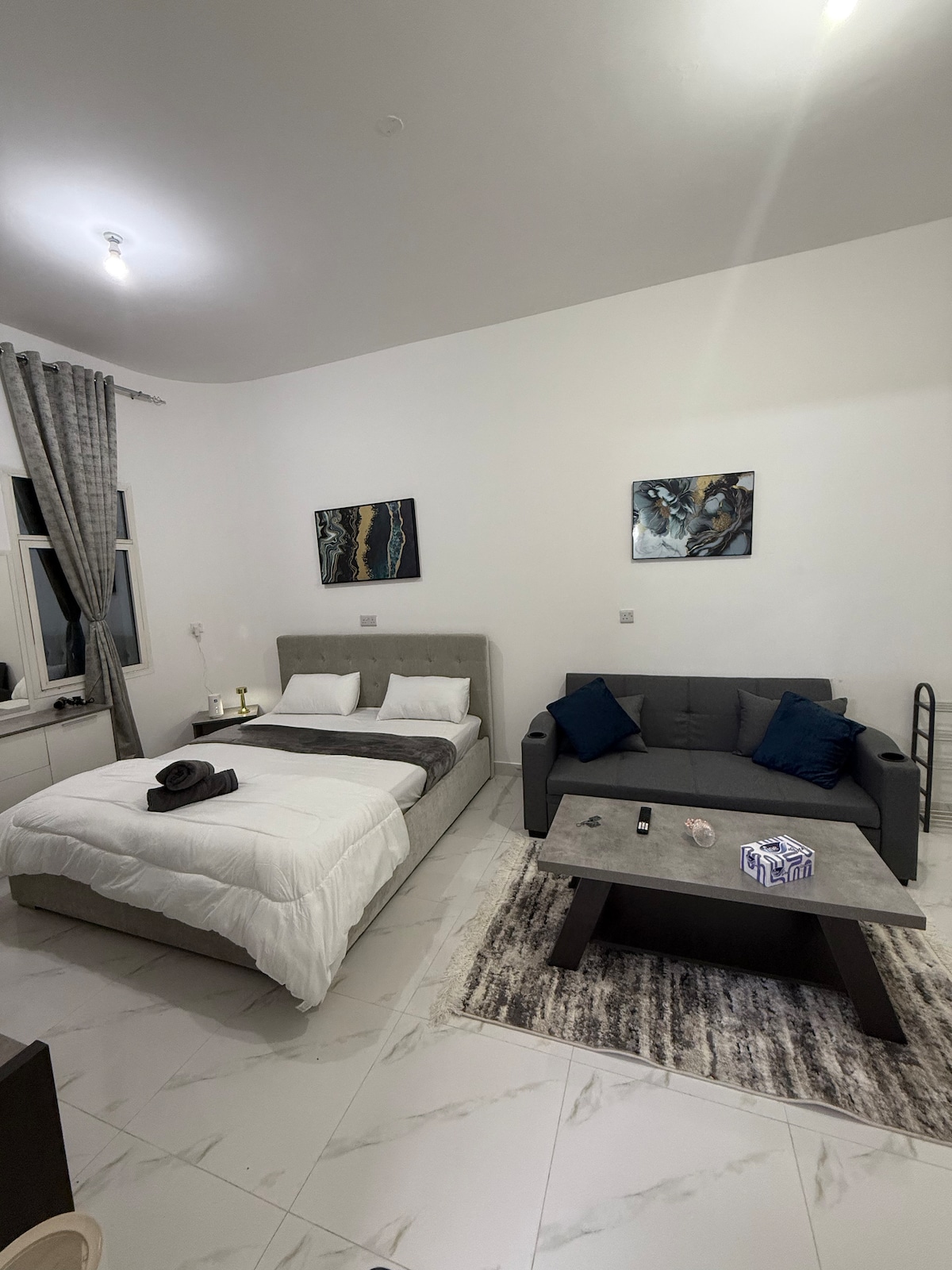 ¡Estudio moderno cerca de la isla de Yas y el aeropuerto! Alójate en un elegante estudio a pocos minutos de la isla de Yas y del aeropuerto de Abu Dhabi. Camina hasta la parada de autobús, restaurantes y un hipermercado. Disfruta de un espacio acogedor y totalmente amueblado con una cómoda cama tamaño king, cocina pequeña, wifi rápido y TV inteligente grande. Perfecto para viajes de negocios o de placer, con fácil acceso a la isla de Yas, al aeropuerto de Abu Dhabi, al centro de Abu Dhabi y mucho más. Ubicado en una zona segura y tranquila para una estancia sin complicaciones.