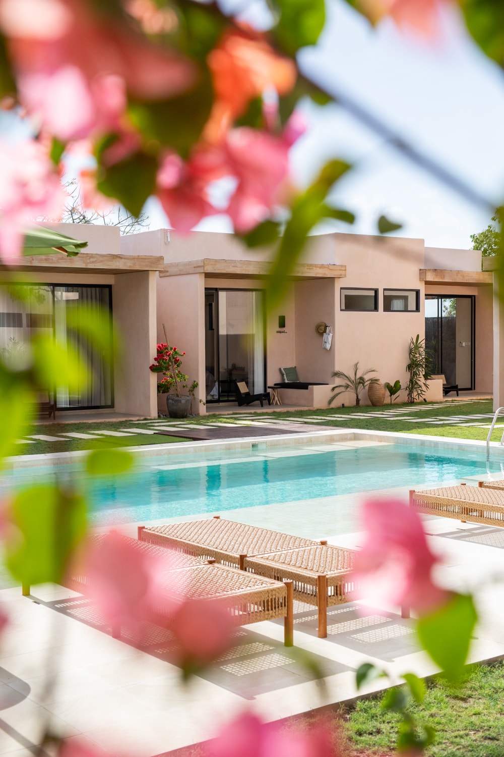 Vista del campo de arroz y la piscina de la villa Canggu "Ohayou" de Lotus 8