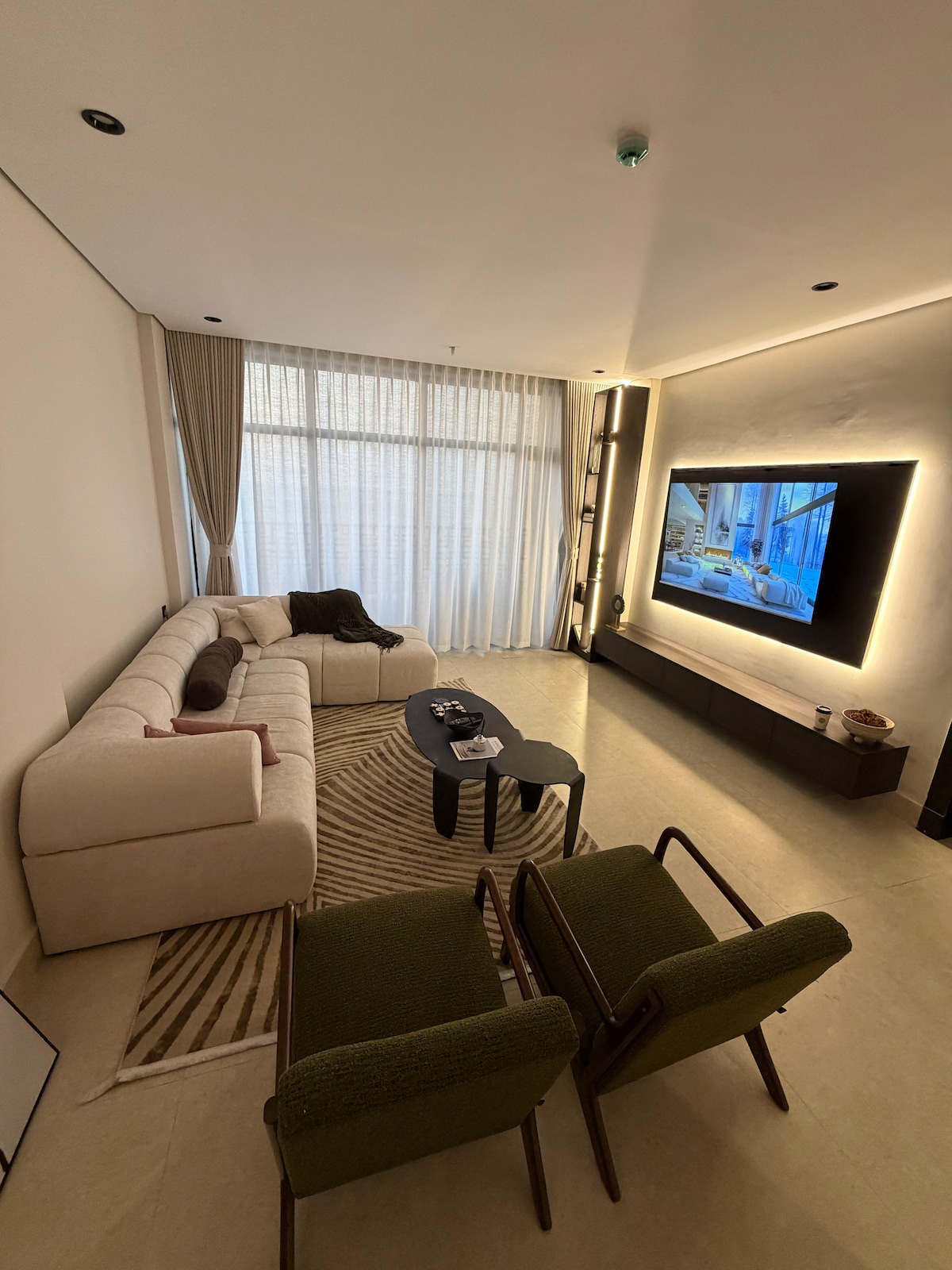 � شقة فاخرة بإطلالة مفتوحة + صالة سينما خاصة 🎬 استمتع بإقامة راقية في شقة عصرية بتصميم هادئ وأنيق، تجمع بين الفخامة والراحة، مع إطلالة مفتوحة وبلكونة مميزة وجلسة خارجية مثالية لأوقات الغروب 🌅 الشقة مثالية للعوائل، الأزواج، أو قروبات الأصدقاء الباحثين عن تجربة مختلفة ومريحة ✨ مميزات إضافية شاشة 70 بوصة اشتراكات ترفيه (Netflix – YouTube وغيرها) دخول ذاتي واي فاي عالي السرعة مطبخ متكامل بالأجهزة طاولة طعام أنيقة