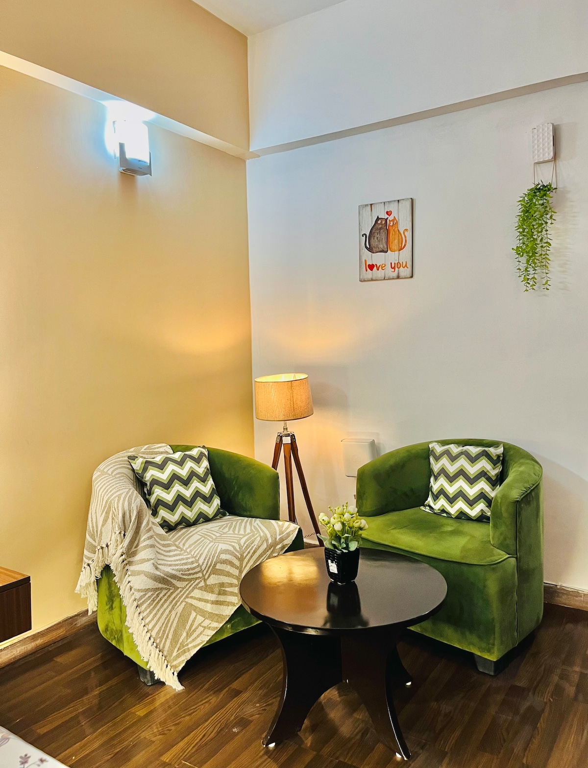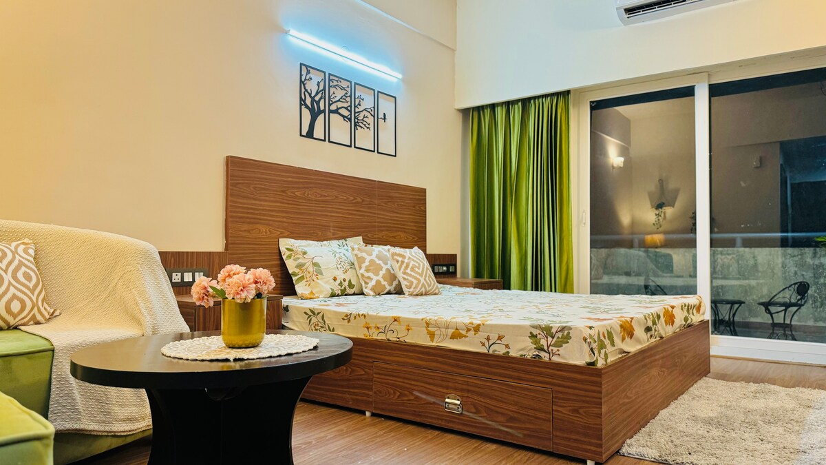 Bienvenido a Midnight Moon Retreat, un tranquilo y elegante 1BHK de lujo oscuro inspirado en la belleza de la luna y el cielo nocturno. El dormitorio cuenta con una pared con un halo de luna brillante, iluminación ambiental suave y tonos carbón profundos que crean un ambiente acogedor, relajante y de primera calidad. Este espacio es perfecto para parejas, viajeros solos o cualquier persona que busque una estadía privada y estética.