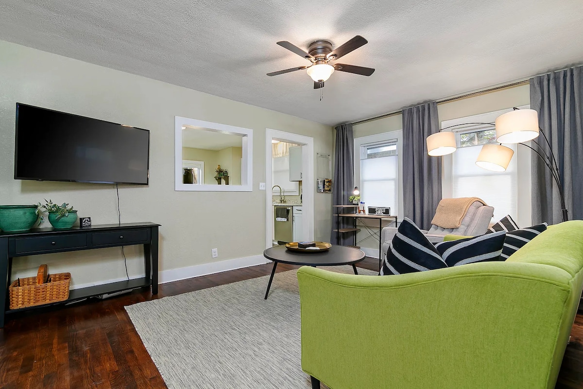Disfruta de una experiencia elegante con algunas características nuevas y antiguas que Rustic Charm tiene para ofrecer en este alojamiento céntrico. Rustic Charm hará que cualquier estancia sea divertida, cómoda y acogedora. 1 dormitorio con una cama tamaño king, un armario y una caja fuerte para guardar tus pertenencias personales. La sala de estar ofrece una hamaca interior (límite de peso de 350 libras) en la que podrás relajarte después de un largo día. 2 televisores inteligentes con internet de alta velocidad y servicios de streaming disponibles. Chimenea eléctrica durante todo el año en el dormitorio.