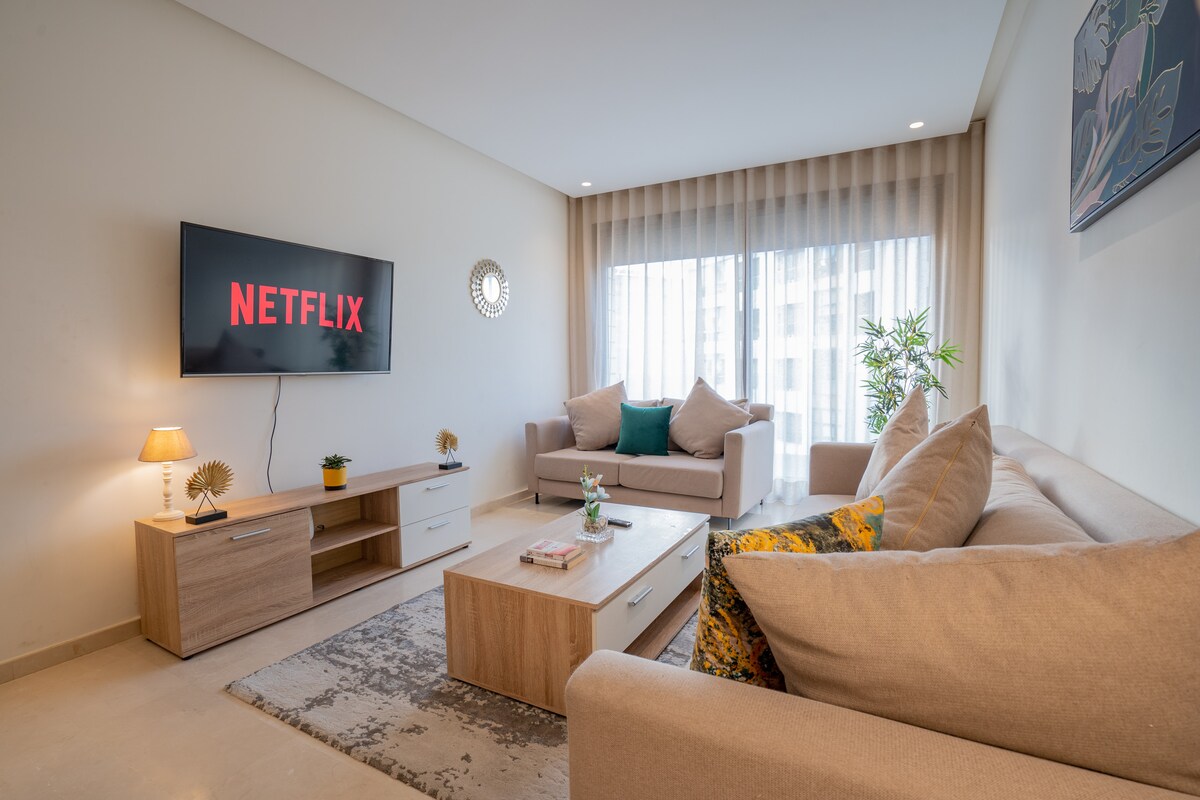 ¡Butterfly 703🦋, un remanso de paz donde la elegancia de una residencia moderna se combina con la comodidad de los hoteles de 5* en el corazón de Casablanca! Relájese en una amplia sala de estar de diseño moderno, equipada con Smart TV de 55’ con Netflix e IPTV para noches de relajación absoluta. La habitación, un verdadero nido acogedor, le promete noches tranquilas y reparadoras ☁️ ¡Desde su balcón privado, admire las espléndidas puestas de sol sobre la ciudad, haciendo que cada momento de su estadía sea inolvidable! ✨