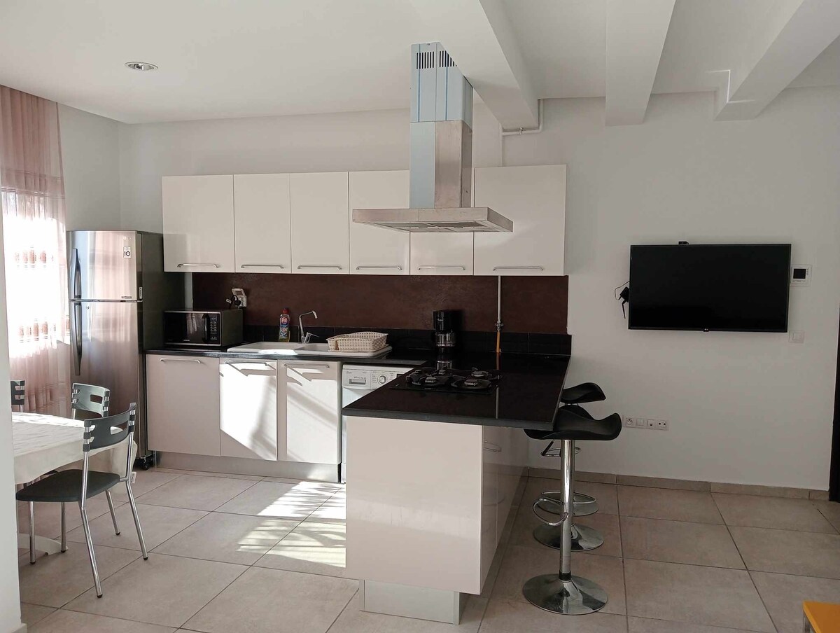 Apartamento S+1 con Internet gratuito para 2 adultos y 1 niño. Situado cerca de los servicios y de la zona turística de Nabeul, a 3 minutos de la playa y en el centro de la ciudad. Asegurado por cámaras de vigilancia y equipado con aire acondicionado, en una zona tranquila. Cocina abierta: nevera, cocina, horno, lavadora y zona de café. Baño completo y zona verde con pequeño jardín Extras: amplio garaje con cámara de vigilancia, puerta automática, cuarto de baño,cocina americana 5€ por día
