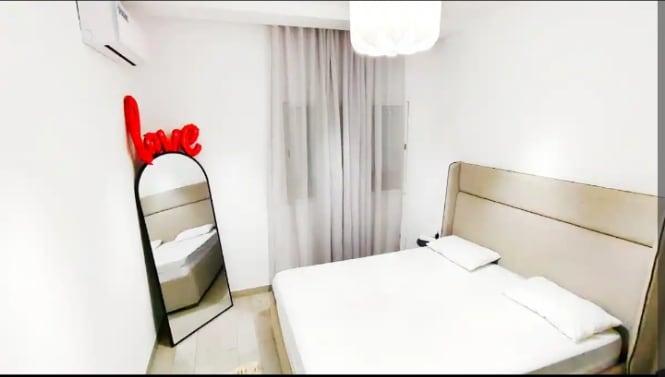 Este apartamento S+2 totalmente equipado ofrece un entorno moderno y cómodo, perfecto para sus estancias en familia, con amigos o en pareja. El apartamento incluye: Dos amplias habitaciones con espacio de almacenamiento Un salón luminoso con Smart TV y aire acondicionado Una cocina equipada (nevera, horno, microondas, utensilios) Un cuarto de baño moderno Ubicación céntrica, cerca de cafés, restaurantes y del zoco A pocos pasos de la playa Wi-Fi de alta velocidad y aire acondicionado en todas las habitaciones
