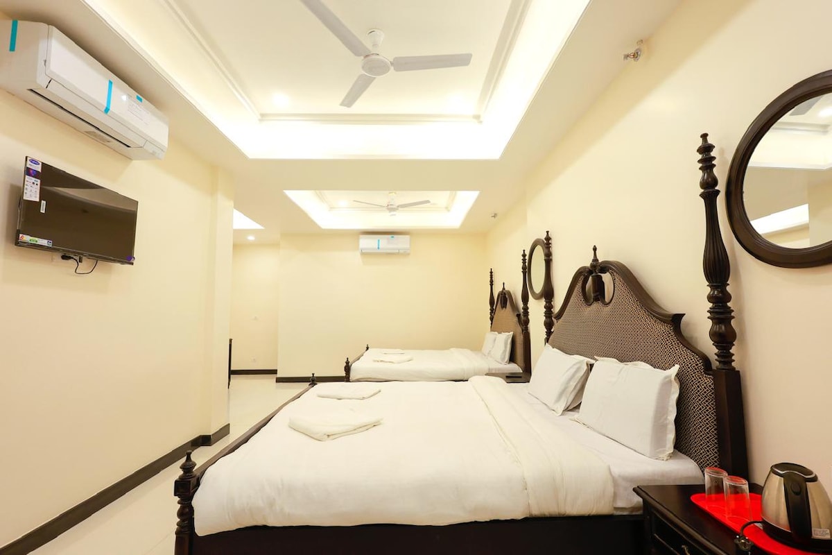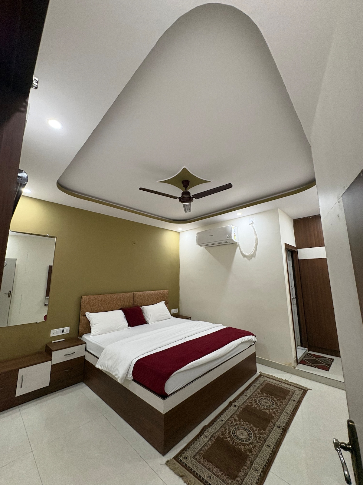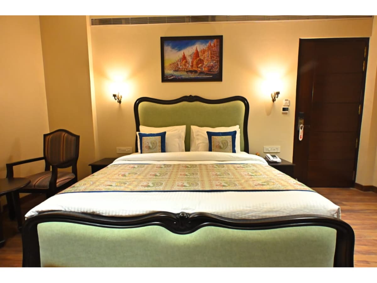 Habitación de lujo cerca del templo Kashi Vishwanath | Comodidad prémium y estadía tradicional Diseñada con interiores modernos y comodidades de primera calidad, la habitación cuenta con aire acondicionado, ropa de cama lujosa y un baño bien equipado. Los huéspedes pueden disfrutar de la vibrante energía de las calles del templo. Ideal para peregrinos, parejas y viajeros que buscan comodidad y clase, nuestro espacio garantiza serenidad a pocos pasos de lo divino. Reserva ahora para experimentar el alma de Varanasi envuelta en comodidad, lujo y tradición.