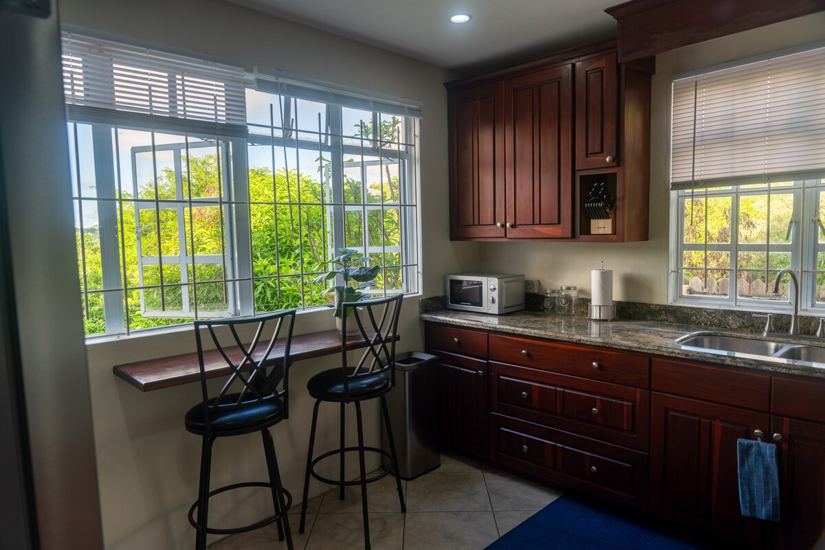 Mountain View Apartments se encuentran en la cima de una colina en una zona pintoresca y muy tranquila. Una cómoda sala de estar con spa en el lugar para proporcionar una experiencia holística caribeña. La brisa atlántica puede relajarse y ofrecerte una sensación terapéutica de relajación a través de puertas correderas de vidrio que se abren a las colinas. Presta atención a que salga el sol sobre las montañas todas las mañanas. Debido a que el propietario vive en la propiedad, todas las necesidades se satisfarán rápidamente.