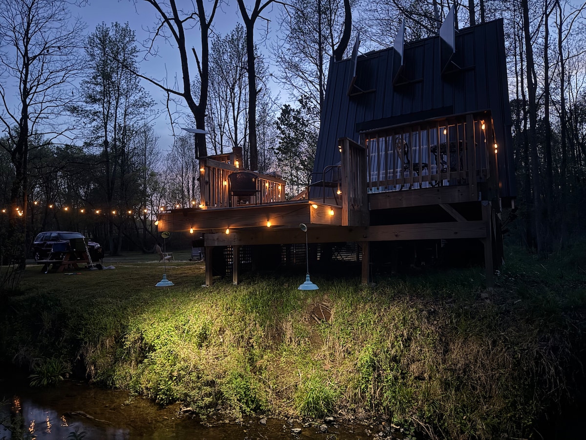 off-grid A-frame bordering creek