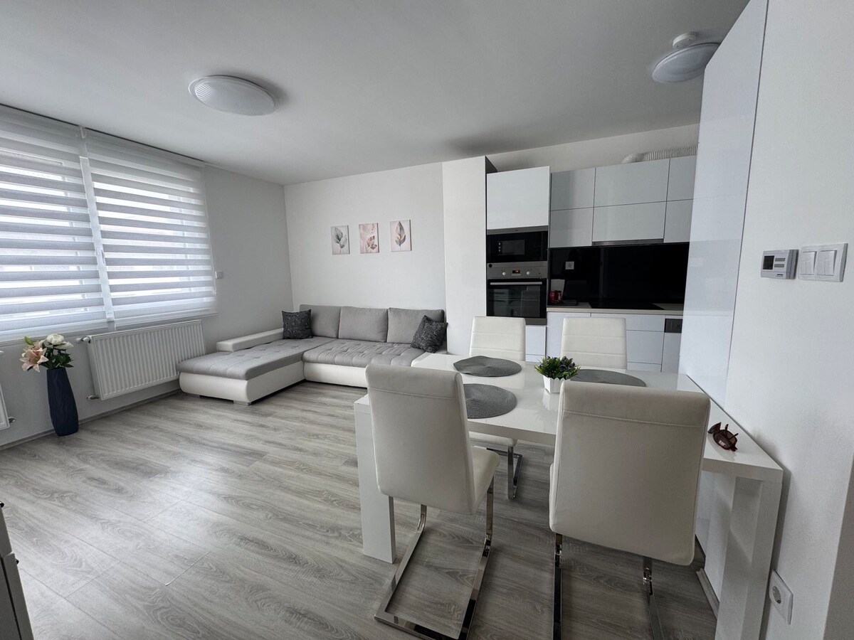 Apartamento de lujo de 43 m2 con mobiliario moderno y balcón. El apartamento tiene 1 dormitorio, un comedor y una sala de estar combinados, una cocina bien equipada y un baño con ducha. El dormitorio tiene una cama doble. La cocina está equipada con todos los electrodomésticos como horno, vitrocerámica (placa de cocina), cafetera, microondas, nevera, lavavajillas e incluso hay lavadora.