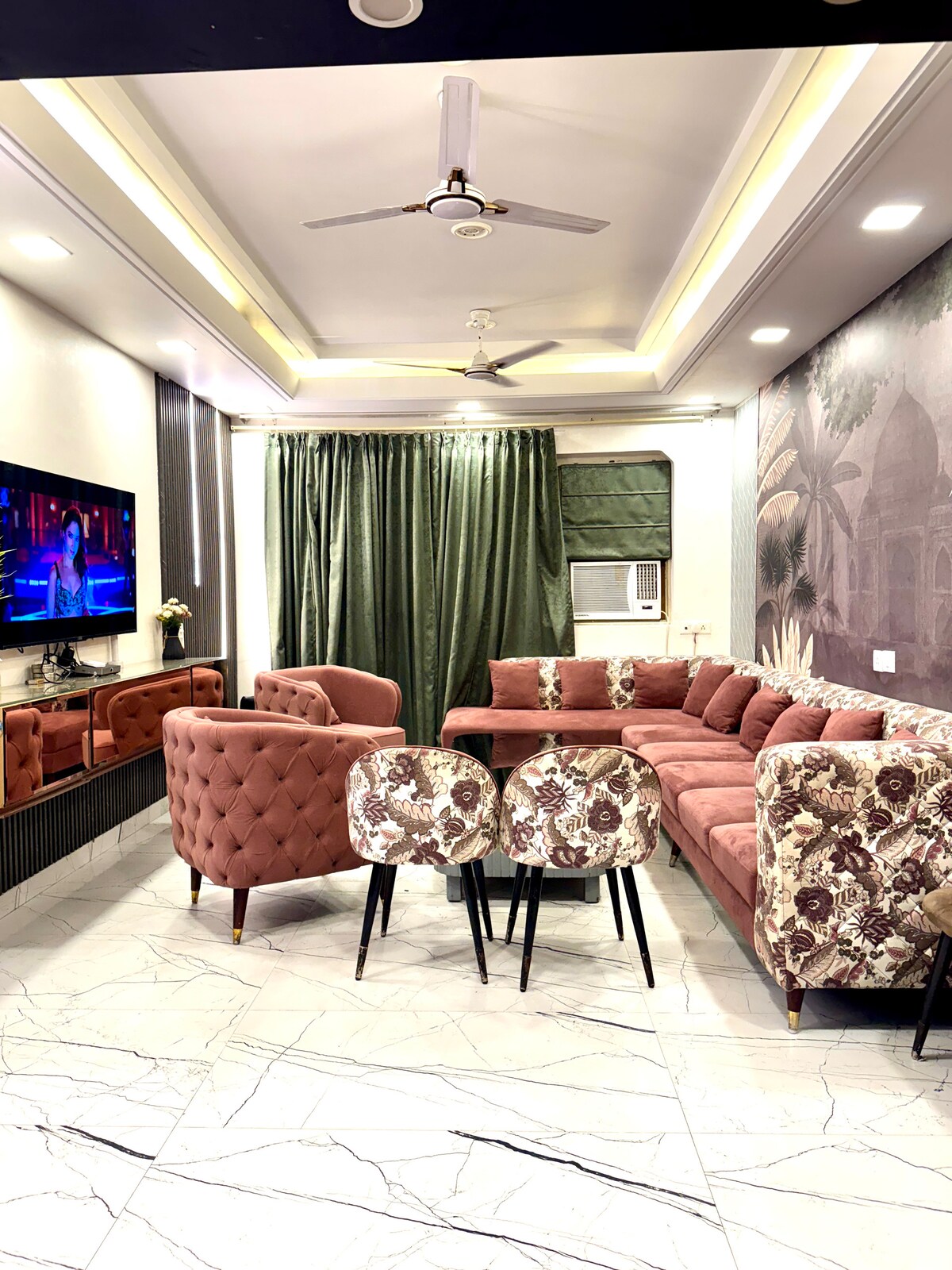 Nestled in the heart of Delhi, our enchanting property offers a sanctuary of tranquility amidst the bustling cityscape. Step into our private haven adorned with lush greenery and season fruits Indulge in the mesmerizing ambiance of our multi-color lighting in the hall, casting a soft glow upon our plush 12-seater sofa, inviting you to sink into blissful relaxation. For the modern-day nomad, our high-speed internet ensure seamless productivity amidst the comforts of home.