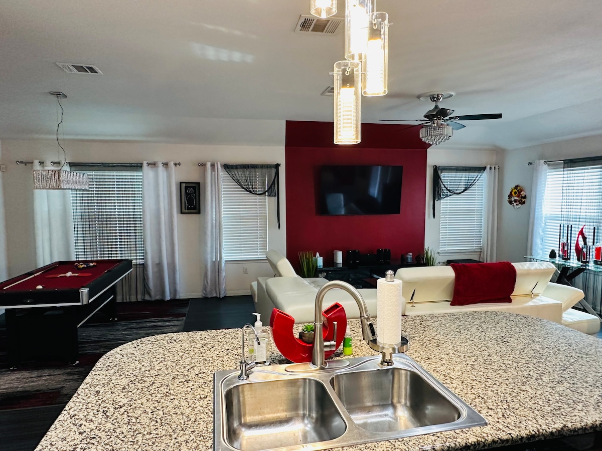 Ve a ver un partido en el Express Dell Diamond o date un chapuzón en el parque acuático Kalahari Resorts, ubicado a 1 minuto de esta elegante casa de Round Rock. Crea comidas gourmet en la hermosa cocina que cuenta con una gran isla de granito. Disfruta de un picnic y fuegos artificiales (durante la temporada de béisbol y el 4 de julio) en el patio con una parrilla perfecta para una barbacoa de Texas. Casa completa (aprox. 1588 pies cuadrados) con 3 dormitorios, 2 baños, 1 sala de estar, 1 comedor y una hermosa cocina espaciosa + sala de juegos en el garaje. Disfruta del patio trasero equipado con parrilla y mesa de pícnic al aire libre. Tienes acceso a toda la casa, incluido el garaje (sala de juegos convertida). También tienes acceso al patio delantero y trasero. Acceso al hogar: entrada sin llave. Si tienes alguna pregunta, no dudes en llamar o enviar un mensaje de texto. La casa está enfrente del Dell Diamond, el parque acuático Kalahari Resort y varias tiendas de comestibles. Sal a correr por uno de los senderos para correr cercanos en Old Settlers Park. El lago Travis y la ciudad de Austin están a poca distancia en coche. Magnolia Market, Magnolia Table y Press Coffee Co (negocios de Chip y Joanna Gains) están a solo una hora de distancia. En coche. Por favor, aparca en la entrada. Por favor, no aparques en la acera. Manual de la casa disponible en la mesa de la entrada para ayudarte a navegar por la casa :)