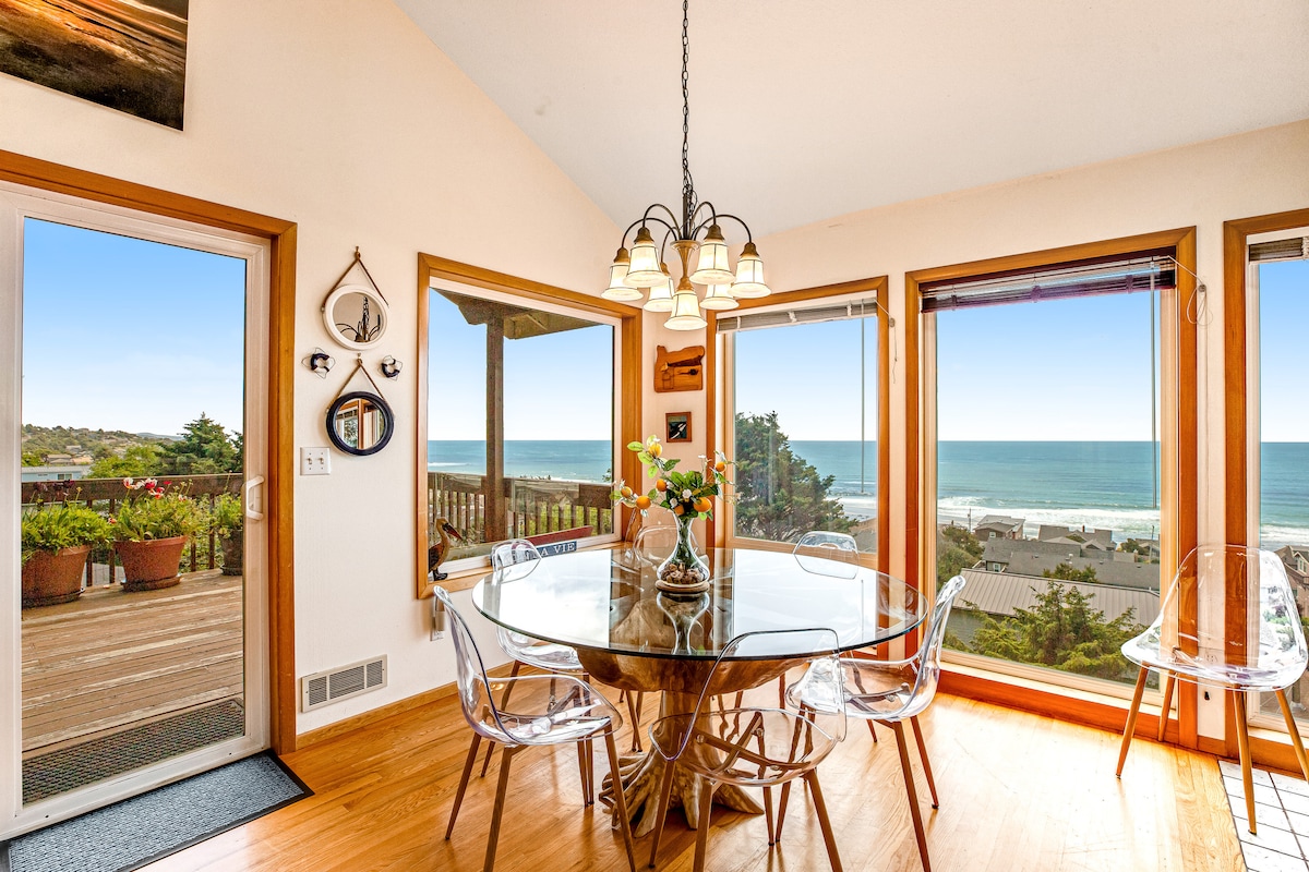 Ocean Blue es una hermosa casa frente al mar que admite perros. Tiene capacidad para amigos y familiares, capacidad para 6 personas con 3 dormitorios y 2 baños. ¡La sala de estar, el comedor y 2 de los 3 dormitorios tienen vistas al mar para disfrutar de unas vistas inmejorables! Una gran terraza con una barbacoa para asar a la parrilla y muchos asientos para ver ballenas y las impresionantes puestas de sol. El histórico paseo marítimo de Newport y el distrito de Nye Beach están a 7 millas al norte, ambos repletos de maravillosas tiendas y restaurantes. Crearás muchos recuerdos maravillosos en Ocean Blue.