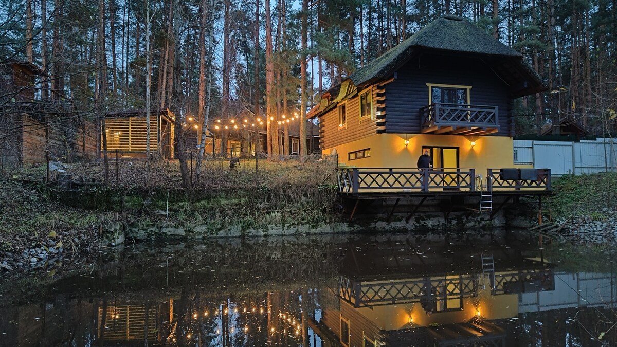 Alquila una casa en el bosque, a 200 metros del lago. Acogedor y hermoso, rodeado de un bosque. Centro de Kiev a 25 km. La casa está construida con materiales naturales