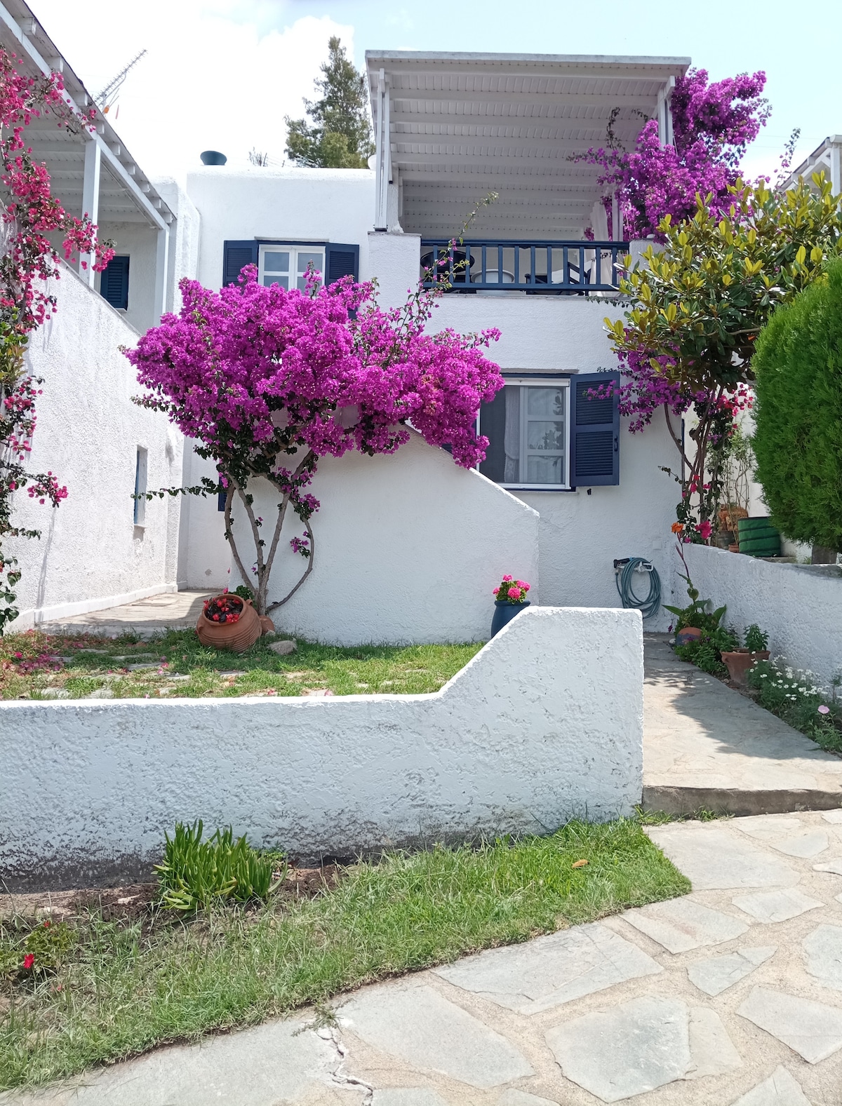 Nuestra casa tiene 105 metros cuadrados de tres dormitorios, uno de los cuales es un ático con una cama doble. Tiene una cocina totalmente equipada y lavadora, así como un jardín de 850 metros cuadrados con barbacoa. Hay fácil acceso a la playa Toroni, que está a 300 metros de distancia.