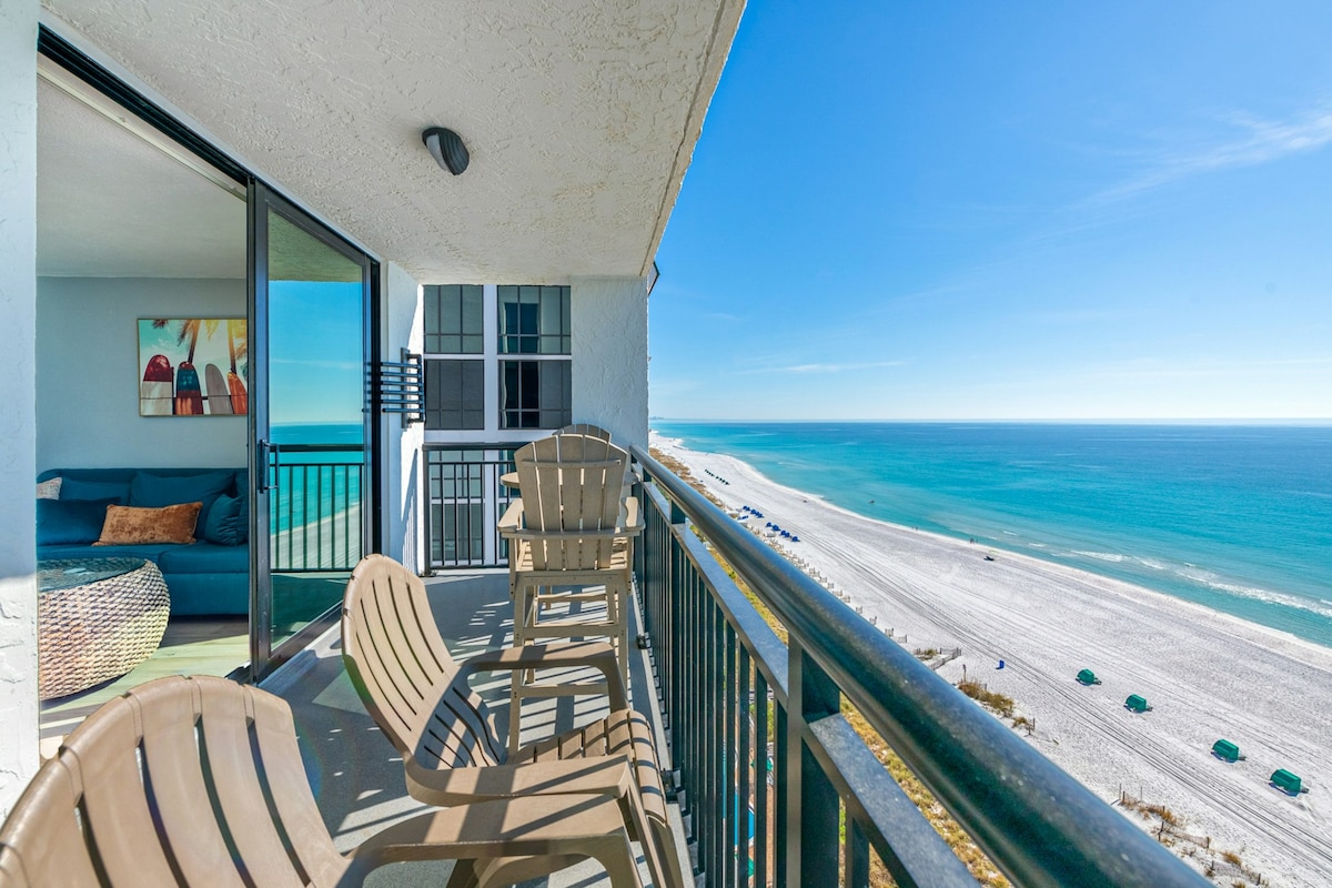 Beachfront Corner Condo in Destin - Panoramic Gulf Views Summer dates just released! Experience luxury in our Destin beachfront condo! This 3-bedroom, 2-bath unit offers panoramic Gulf views from the living area, kitchen, and master bedroom. Enjoy a renovated balcony, heated pool, tennis, basketball, pickleball, gym, and sauna. Beach chairs and umbrella included March-October. Convenient elevator and steps access. Book your Destin vacation rental now for an unforgettable beach getaway!