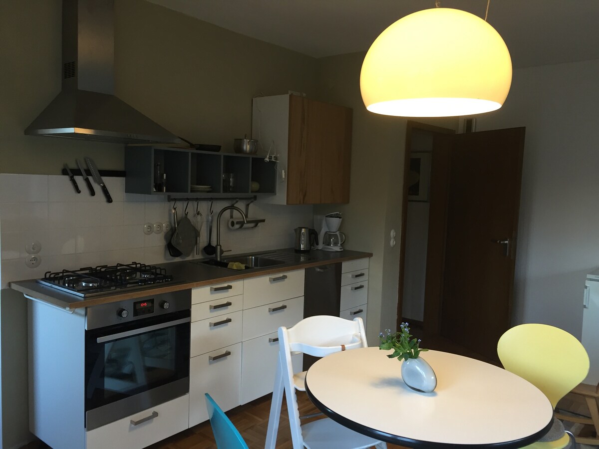 Sunny apartment close to downtown with a terrace in a quiet and preferred residential area with free parking. The newly renovated holiday apartment can accommodate up to 6 guests comfortably with two rooms with posibility to sleep. The apartment offers a fully equipped kitchen. Suitable for vacation, hikers, visitor accommodation, seminar participants, fitters and craftsmen. Work is also possible: Fast Internet with LAN/WLAN, posibility to print. Welcome!