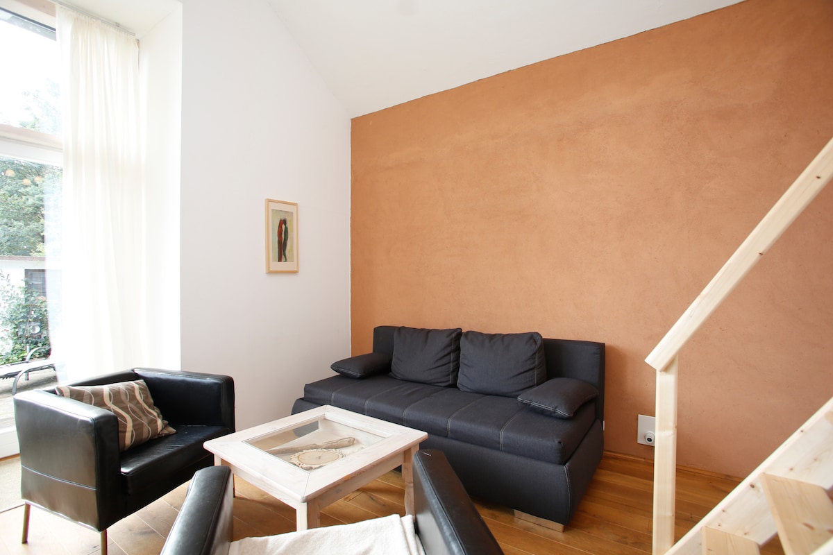 The freshly renovated apartment is situated in a light souterrain of a flat-roofed bungalow that is located in a calm and quiet neighborhood in the north of the city. The apartment includes a large bedroom with a king size bed, a cozy living and dining room with a comfortable pullout couch, a modern shower bath and a complete built-in kitchen. The city center is only a fifteen minute walk away, but there is also a bus station right in front of the door as well as free parking.