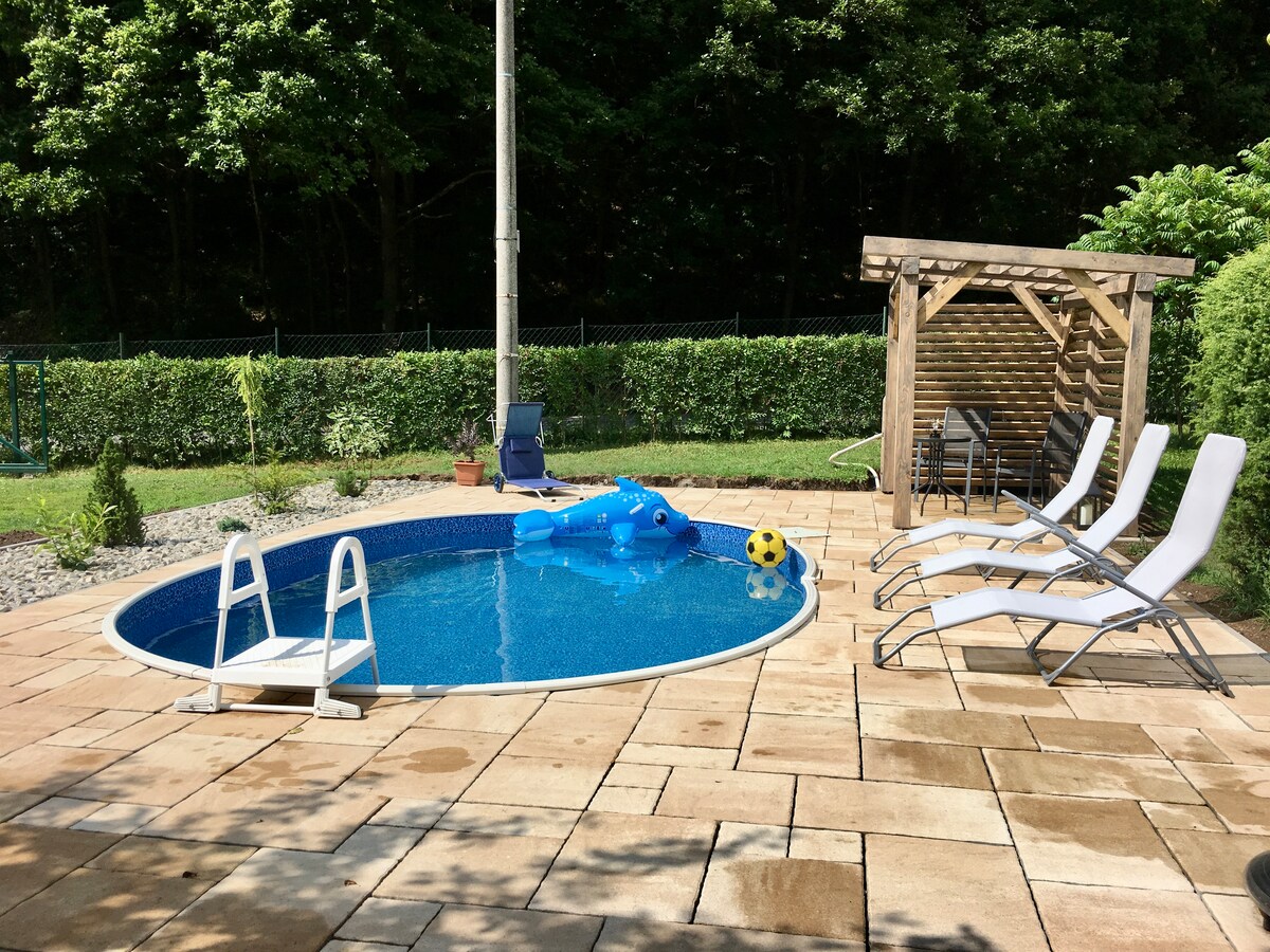 Bienvenido a nuestra casa en el lago, que ofrece una escapada inolvidable de la realidad en la hermosa naturaleza virgen. La casa con terraza se encuentra en una enorme parcela con su propio estanque en absoluta privacidad. Está amueblada de forma moderna, hay una cocina totalmente equipada, una sala de estar con TV, 2 dormitorios, un baño y un aseo. Por supuesto, hay aire acondicionado, WiFi y aparcamiento. También hay una chimenea al aire libre en el recinto. ¡Estamos deseando recibirle!