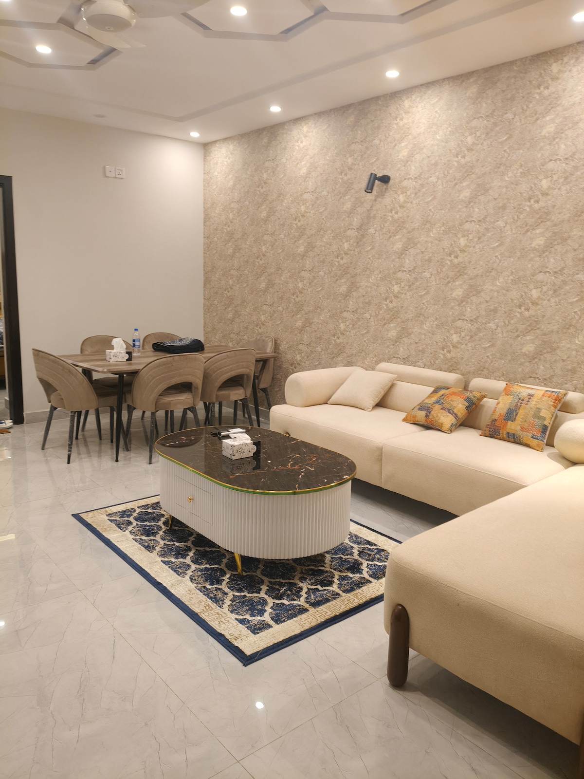 Apartamento de lujo en DHA Phase 8, a pocos minutos del aeropuerto de Lahore. Perfecto para familias, viajes de negocios y estancias largas. Disfruta de wifi rápido, energía de respaldo, estacionamiento seguro, ascensor y una cocina totalmente equipada con té, café y aperitivos gratuitos. Cerca de tiendas, restaurantes y del complejo deportivo DHA. Seguridad las 24 horas del día, 7 días a la semana para tu tranquilidad. ¡Limpio, tranquilo y cómodo! ¡Reserva ahora para disfrutar de una estancia tranquila y sin estrés cerca del aeropuerto!