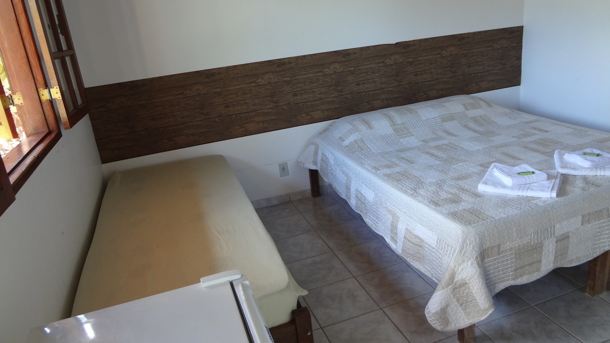 Es una casita construida en permacultura, con cama doble, baño completo, ducha caliente, enchufes, ventilador, mosquitero, en medio del bosque de la montaña, muy cerca de cascadas, cuevas y pinturas rupestres. Con cocina colectiva a disposición y zona social cubierta con mesas para trabajar/estudiar y comer. Una propuesta de calidez sencilla en medio de la naturaleza. Además, contamos con un servicio de cantina casero que sirve comida de Minas Gerais, pasta y pizza a precios populares.