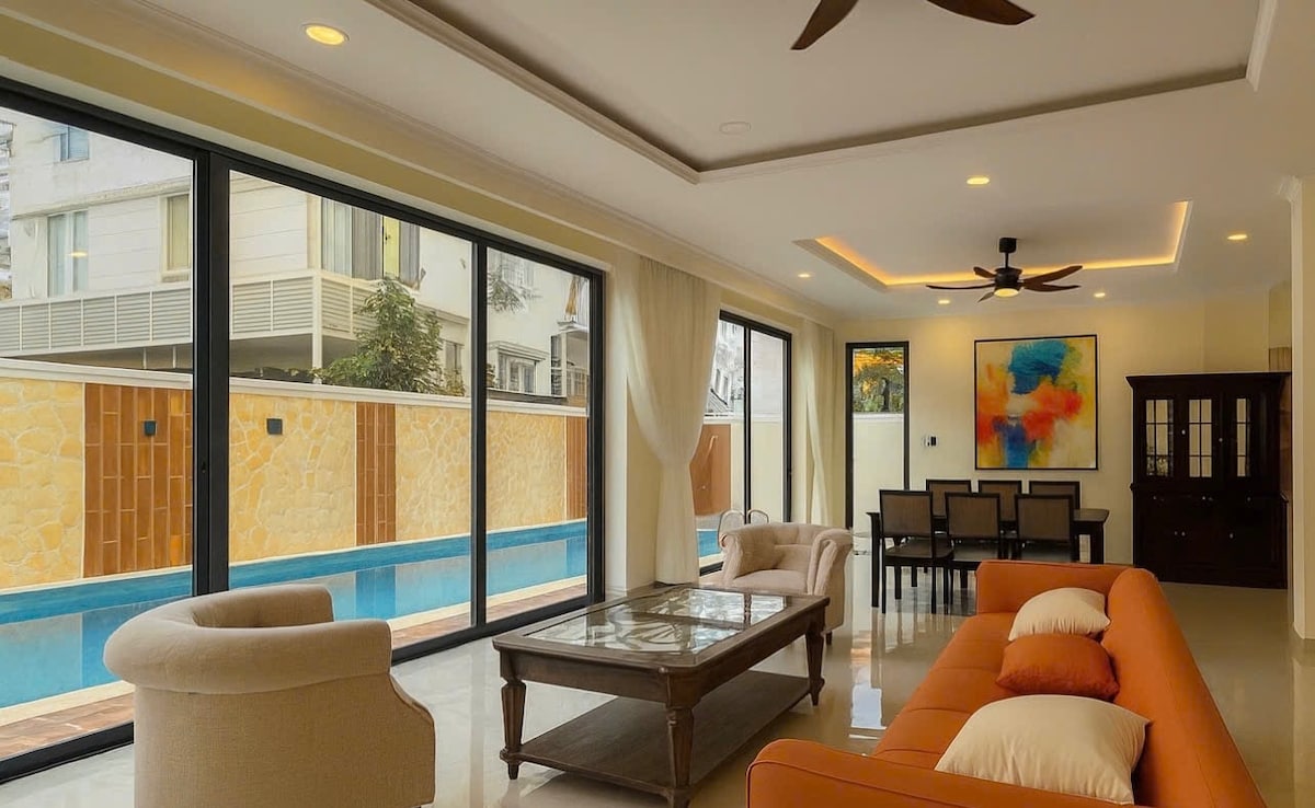Amplio dúplex | 4 dormitorios, 4 baños | Piscina de inmersión privada SANTUARIO DE JARDÍN Nuestra casa es una suite de 2 pisos que alberga hasta 8 huéspedes. Cuenta con su propia entrada, piscina, jardín y cocina, para que disfrutes. Ubicada en un barrio tranquilo y exclusivo en el Distrito 7, esta es la unidad inferior en un edificio dúplex con solo 1 otra residencia arriba. Sal a un parque tranquilo y a un lago ecológico pintoresco. A poca distancia, encontrarás una variedad de restaurantes, cafeterías, spas y el supermercado LOTTE.