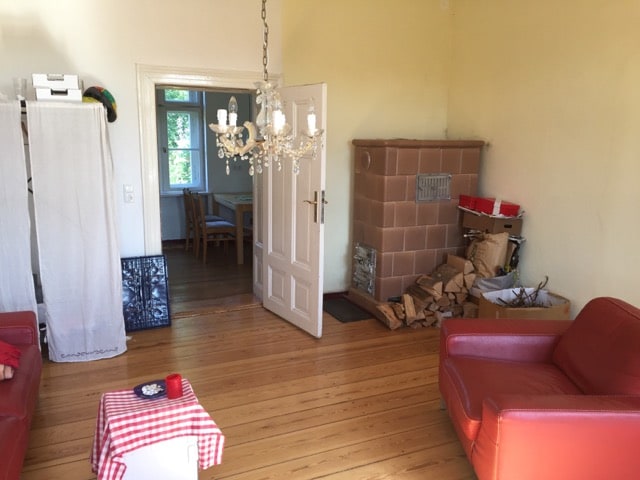 Rodeada solo de prados y campos, escondida detrás del estanque del pueblo, se encuentra la pequeña finca señorial con su casa principal y sus antiguos establos. Durante los últimos cinco años, hemos estado restaurándola cuidadosamente, dando nueva vida a la finca de 1899. En la planta superior de la casa señorial, un edificio de ladrillo típico de la región, te espera un espacioso y luminoso apartamento de 114 metros cuadrados. Las viejas vigas vuelven a ser visibles. El interior es sencillo y no distrae.