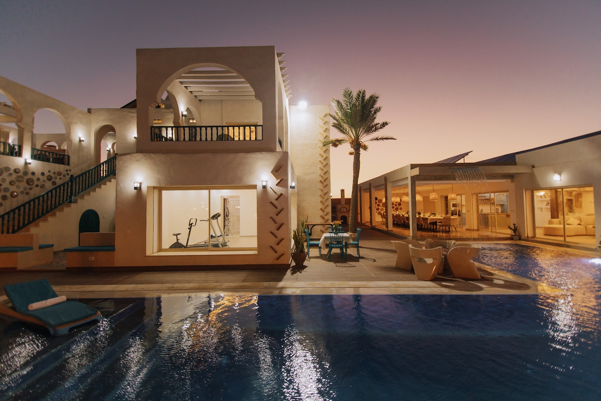 Novedad en la isla de Djerba ❣️ DESAYUNO INCLUIDO :) Situada en la ciudad de Midoun y a solo: - A 5 minutos en coche del mar - A 10 minutos en coche del campo de golf de Djerba Esta villa excepcional combina sutilmente la arquitectura tradicional tunecina con un diseño moderno. Consta de 3 elegantes suites, cada una con su propio baño privado, un acogedor comedor, una cocina totalmente equipada y una espléndida azotea para admirar la puesta de sol.