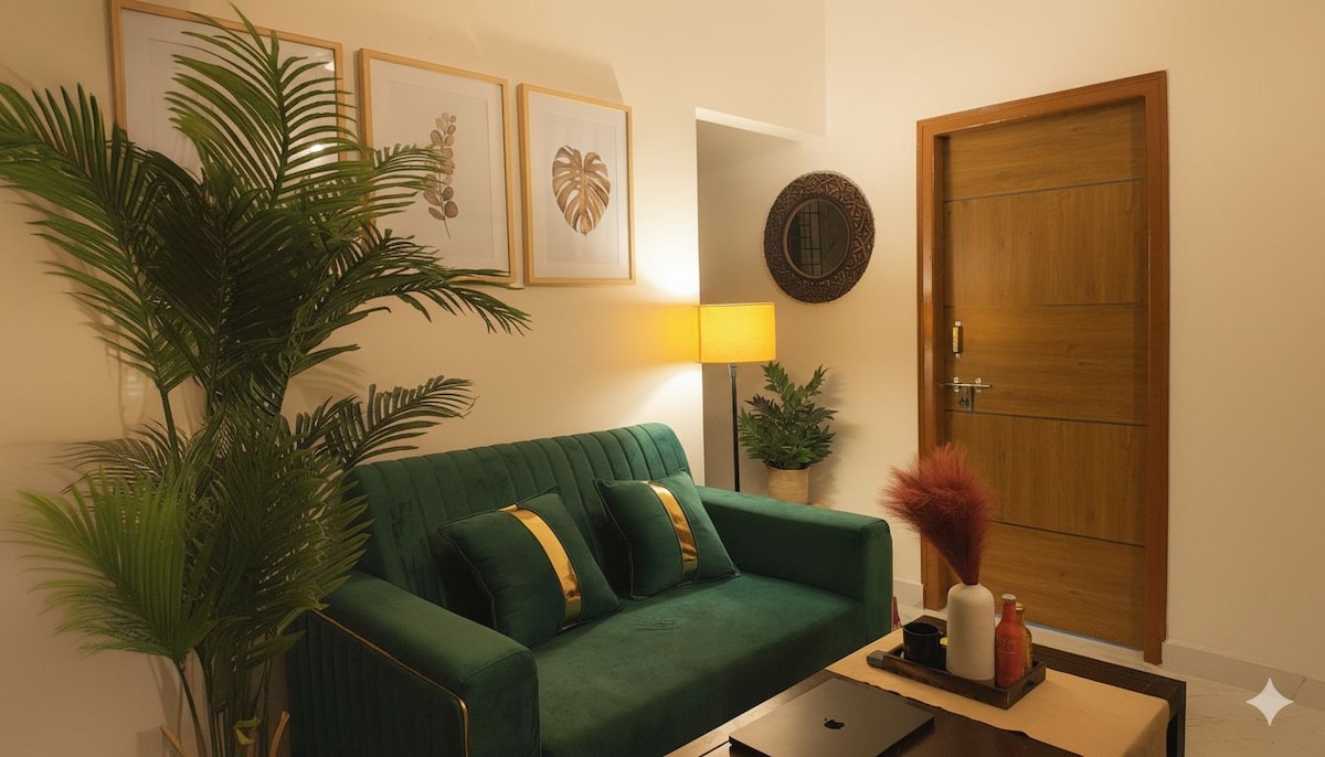 Nos encantaría hospedarte en nuestro 1 BHK (EARTHY Homestay) que combina estilo con un ambiente terroso y tranquilo y panoramas inmejorables. - Balcón Oasis: vistas al bosque + puestas de sol cinematográficas a 200 m - Prime Locale: 2 minutos a NIFT y 3 minutos a las cafeterías, boutiques y comida callejera de 27th Main - Interiores serenos: cama tamaño queen, iluminación ambiental y exuberantes plantas vivas - Trabajo y ocio: wifi de alta velocidad, TV grande y aire fresco Disfruta de estilo, serenidad y puestas de sol espectaculares, ¡todo en un acogedor refugio! - 5ª planta (sin ascensor)