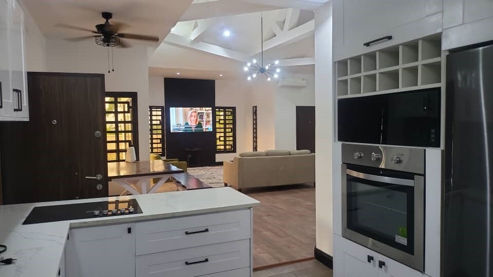Hagamos recuerdos con este lugar único y familiar. La propiedad cuenta con un amplio espacio abierto en el piso abierto Cathedral Beam, diseño de rancho moderno con un patio en la azotea. La propiedad está asegurada con una valla eléctrica alta con abridor automático de puertas. Cada dormitorio tiene su propio baño completo privado y un baño de invitados. Todas las carreteras tarederas desde el aeropuerto hasta la villa (a 35 minutos en coche) en el Jardín Botánico de Aburi, muy cerca del Servicio Nacional de Bomberos.
