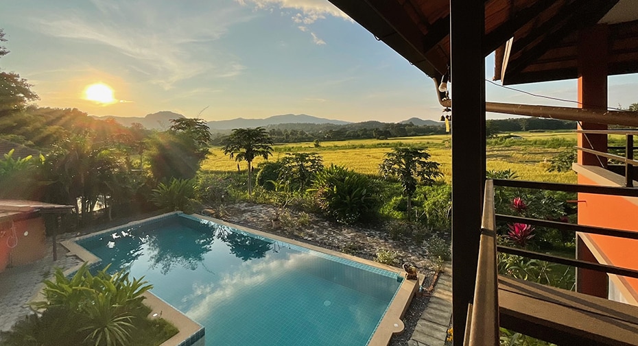 Disfruta de un refugio en la campiña tailandesa en la hermosa zona verde de Luang Nua, Doi Saket. Cerca del embalse que almacena el agua dulce de la ciudad de Chiang Mai, ubicación de rodaje de Rambo 4. La propiedad se encuentra literalmente en medio de campos de arroz con su propia carretera de acceso privado. La propiedad completamente nueva tiene una piscina y un jacuzzi al aire libre rodeado de palmeras. Disfruta del refugio en el campo, pero el centro comercial más grande del norte de Tailandia está a solo 20 minutos en auto.