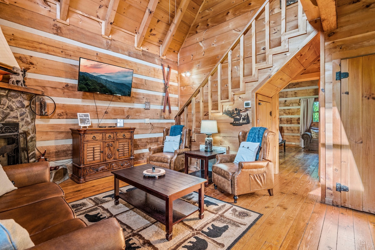 Ubicada en la cima de una montaña privada, esta cabaña ofrece vistas de doble cara🌄, una bañera de hidromasaje para 4 personas🛁 ☀️, 2 relajantes porches cubiertos y una chimenea de propano 🔥 con asientos en Adirondack. Disfruta de corn hole🕳️, una parrilla de carbón🍔, una sala de juegos 🎮 con más de 60 juegos de arcade, futbolín y un loft 🃏 con juegos de mesa. Una cocina totalmente equipada🍳 📺, televisores inteligentes y una chimenea eléctrica de piedra 🔥 completan la escapada perfecta. ¡Relájate y recarga energías!