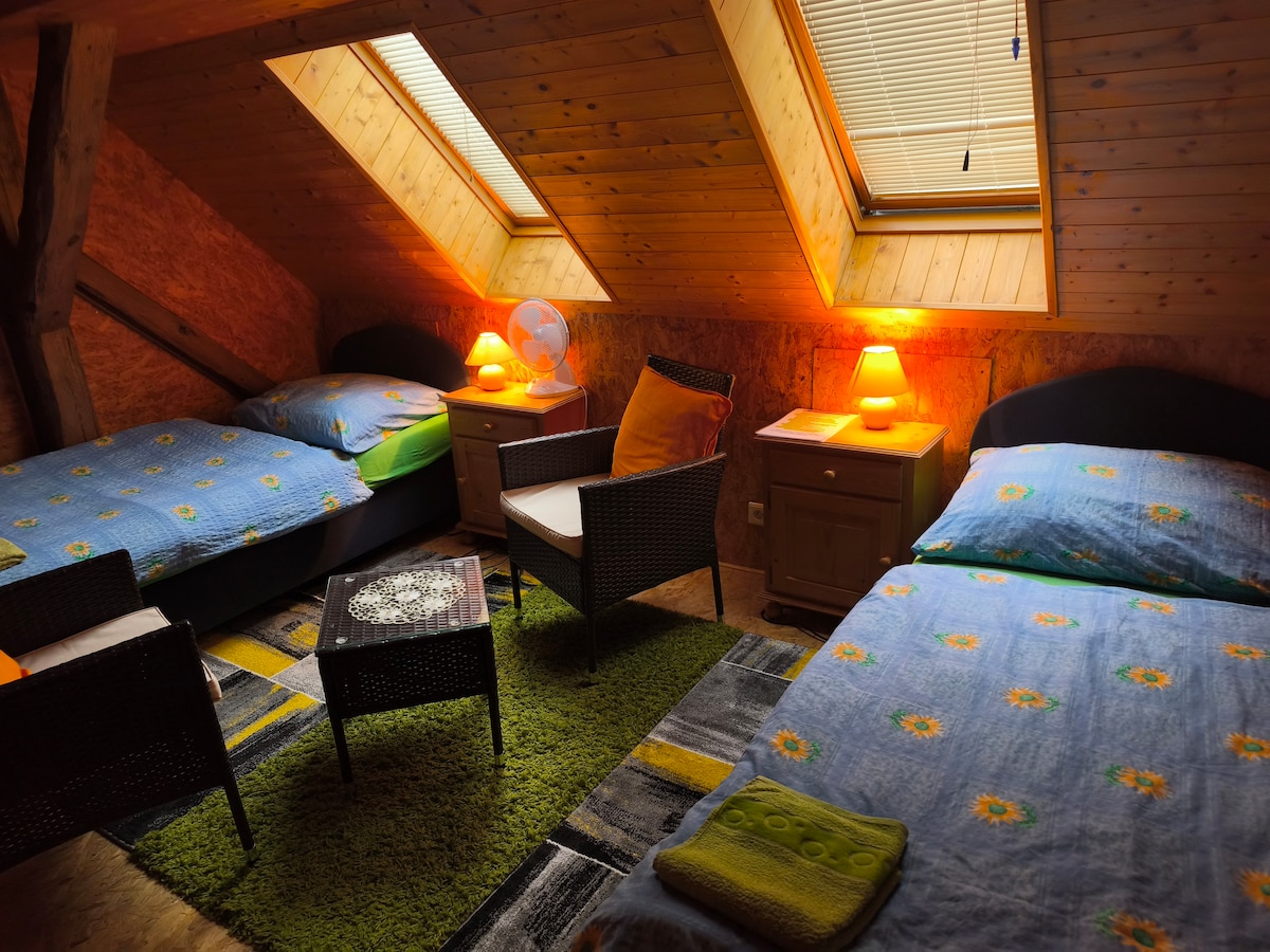 Todo el grupo encontrará comodidad en este espacio espacioso y único. ¿Buscas escapar del ajetreo cotidiano y un lugar para renovar tus fuerzas, disfrutar de la paz y pasar un rato inolvidable con familiares, amigos o colegas? Una granja original renovada de forma única y renovada, te ofrecerá la opción perfecta. En el pintoresco pueblo de Darmyšl, en el corazón de los Siete mágicos, encontrarás el lugar para tu recreación perfecta. La cabaña es el lugar perfecto para escapadas de fin de semana, celebraciones familiares, seminarios o fines de semana de relajación y meditación.
