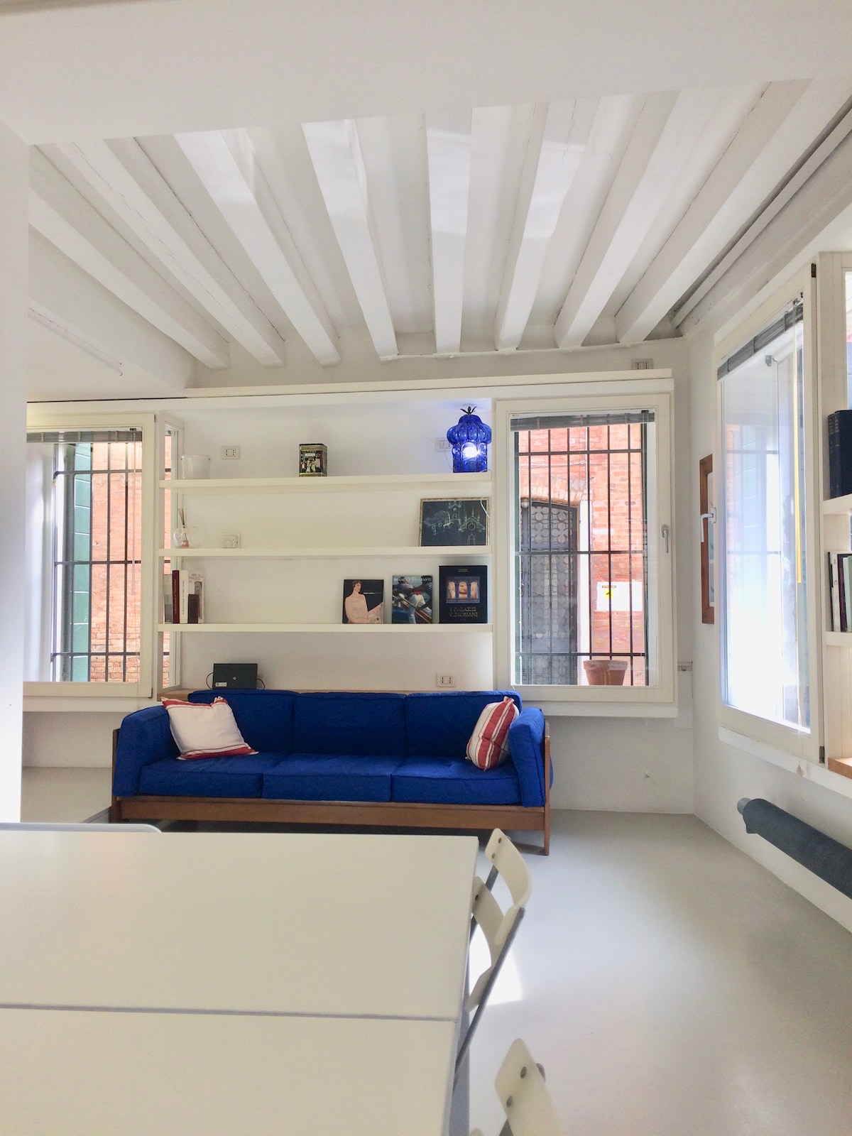 Admire la belleza de Venecia desde las ventanas arqueadas de este acogedor y espacioso apartamento que combina elementos históricos, como vigas de madera, y muebles contemporáneos. Desde los grandes ventanales se puede disfrutar de una hermosa vista del canal, atravesado por góndolas, y de los típicos edificios góticos de Dorsoduro, el barrio más auténtico de Venecia, apreciado por artistas e intelectuales de todas las épocas; encontrará libros y objetos de arte.