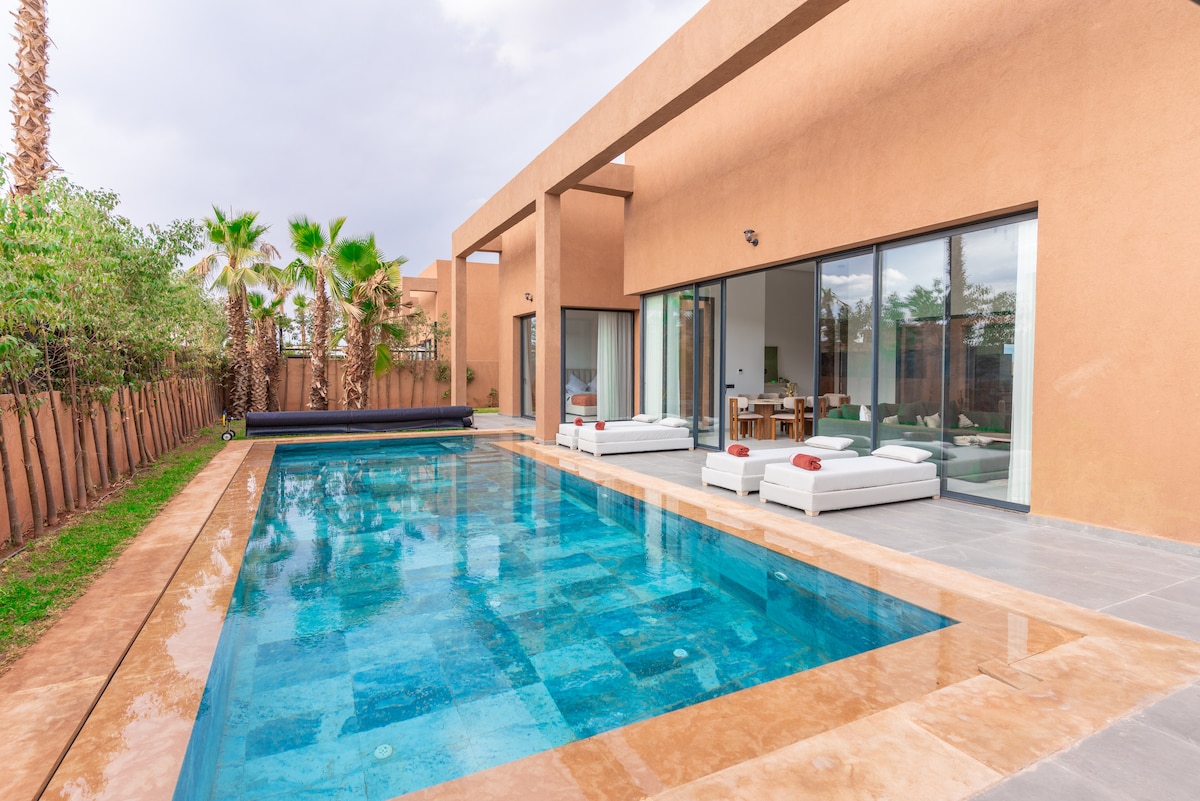 ● 3 min – Famous & Waky Beach ● 5 min – Aqua Mirage, PalmGolf ● 7 min – Bd Mohamed VI, Mégarama, Kart Racing ● 8 min – Al Mazar Mall, Oasiria and Pickalbatros Aquapark ● 20 min – Jemaa El Fna, Airport & City Centre ❤️ Features & Amenities: ● 450 m2 property ● Smart TV + Netflix ● 3 Queen Beds | 2 Modern Baths ● AC & Heating ● Fast Wi-Fi ● Private Heated Pool & Garden ● Fully Equipped Kitchen & Nespresso Machine ● Washing Machine ● Free Private Parking ● Prime Location ● 24/7 Secured Residence