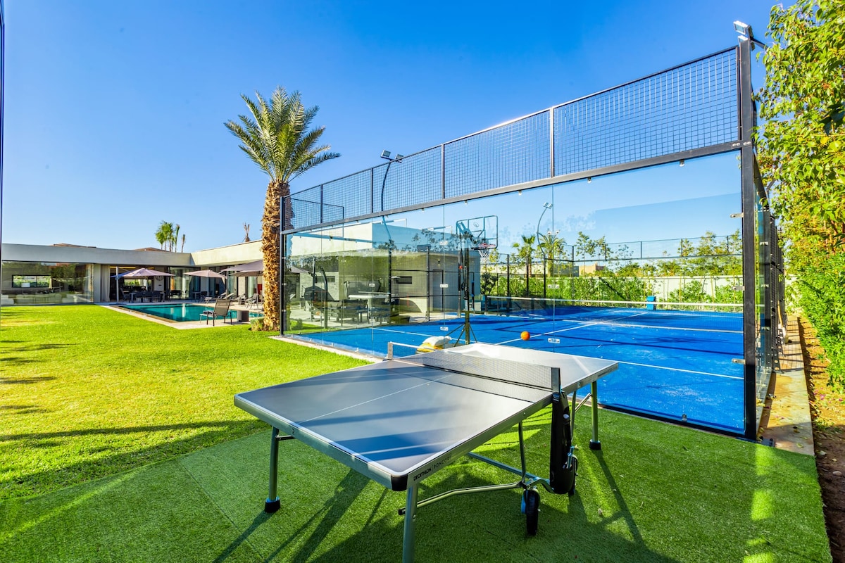 ✨Villa Inès: Elegancia pura✨ 💎 ¡Desayuno GRATIS cada mañana! 🏊 Piscina Climatizada (7x4m) en un jardín paisajístico. 🏸 Voleibol, Bádminton y Ping Pong. 🏡 Urbanización segura 24/7, 15 min del centro y 5 min del Golf. 👩🍳 Gobernata y Chef privado para sus platos a medida. 🛏 4 Suites King de lujo, TVs con Netflix, IPTV. 🚿 Duchas italianas, toallas premium y secador. 👶 Kit de bebé completo (Cuna, cochecito, trona). ✨El arte de vivir en Marrakech.✨¡Envíanos un mensaje!