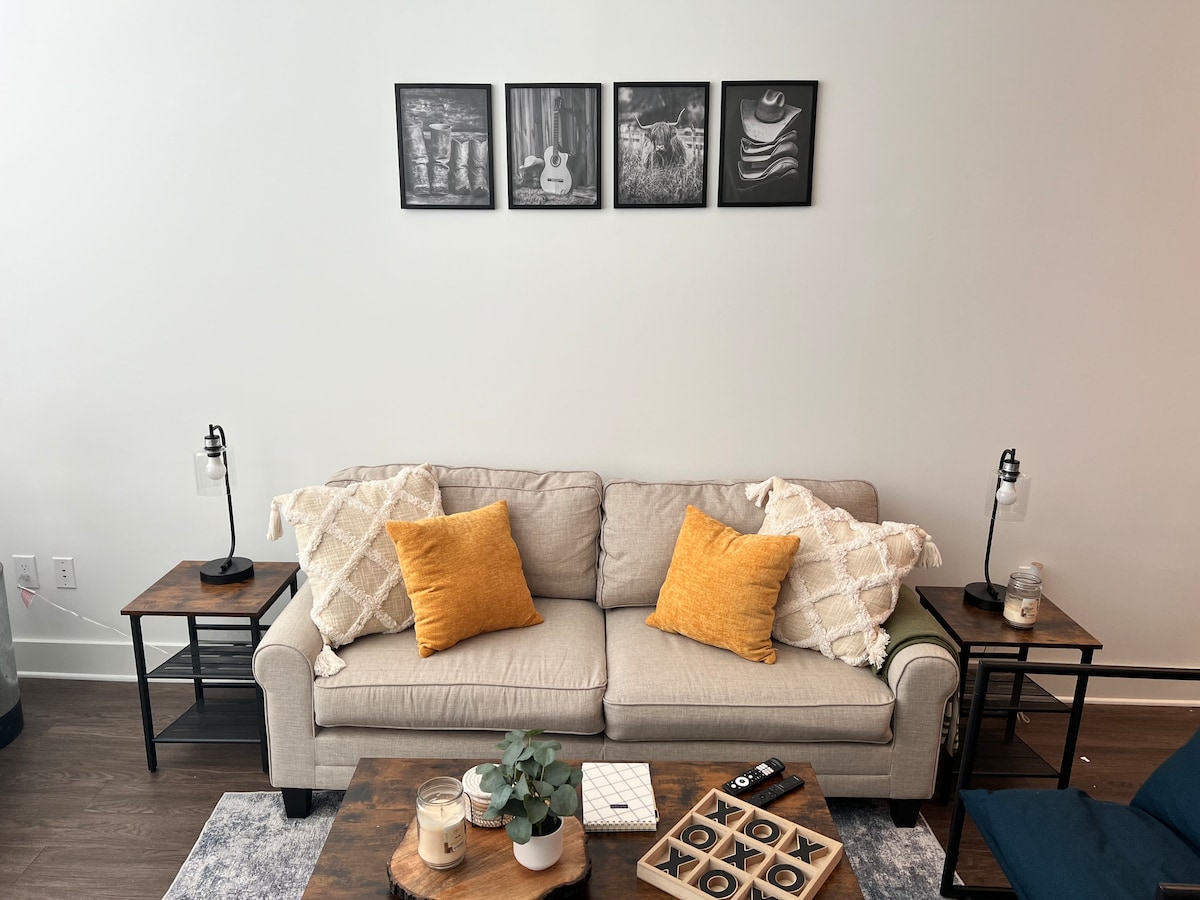 ¡Da la bienvenida a todos los "amantes de la gastronomía"! Siéntete inspirado para cenar en esta unidad temática de "comida de Nashville" ubicada en The Lodge. ¡La cocina totalmente equipada cuenta con electrodomésticos elegantes y un amplio espacio de cocina para los entusiastas de la cocina! No tendrás dificultades para decidir qué hay para cenar. ☆¡Comestibles justo cruzando la calle! ☆Acceso al gimnasio y al baño de vapor ☆¡A pocos kilómetros del Centro de Convenciones Gaylord, DT Nashville, Aeropuerto y Opryland! ☆Auto registro de llegada ☆Cargador para coches eléctricos ★No se admiten mascotas. ★No se permite celebrar fiestas ★No fumar.