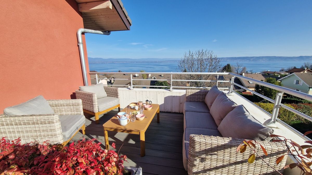 Appartement au rdc d'une maison avec vue panoramique du lac Léman. Idéal familles, à proximité immédiate des vignes et chemin ms de randonnées. A 20' des stations de Thollon les Mémises et Bernex, à 50' d’Avoriaz et de Châtel. Vous recherchez de la tranquillité, un environnement bucolique à 5 min d'Evian et de Thonon , alors notre logement est fait pour vous ! Profitez d'une belle pièce de vie lumineuse et terrasse avec vue sur le lac. Linge de maison et serviettes de toilettes fournis.