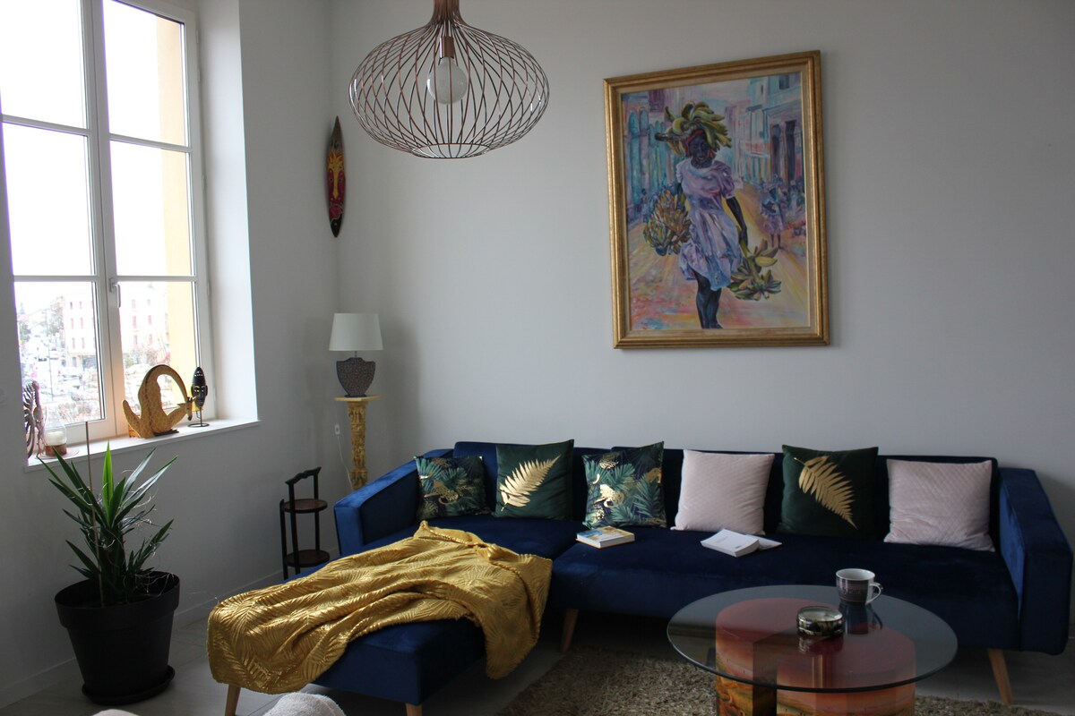 Olvídese de sus preocupaciones 😌 Toda la comodidad de una habitación de hotel en este espacio abierto, luminoso y equipado. Perfecto nido relajante en el segundo piso de esta magnífica casa señorial transformada en 2 viviendas y una peluquería. La cama king size (200*200) con su ropa de cama de calidad le permitirá pasar una noche maravillosa.🌛 Su excepcional bañera redonda también le ofrecerá un momento de descanso absoluto.🤗 El espacio de trabajo y su cocina te encantarán. Aire acondicionado reversible 💨🔥