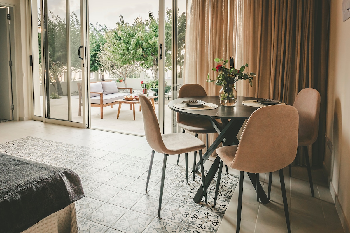 ¡Adéntrate en la serenidad! Escápate a un escondite bañado por el sol en una tranquila ladera. Relájate junto a la piscina, toma el sol y disfruta de impresionantes vistas al mar y puestas de sol doradas. A solo 15 minutos en auto de Pafos, nuestros dos encantadores estudios son la base perfecta para explorar. Las playas, los senderos naturales, el puerto, la laguna azul y el casco antiguo de Pafos están a 15-30 minutos en coche. Wifi gratis, aparcamiento, una plaza con tabernas y un bar de vinos, a solo 4 minutos en coche. El coche es esencial. La piscina está abierta todo el año (no climatizada).