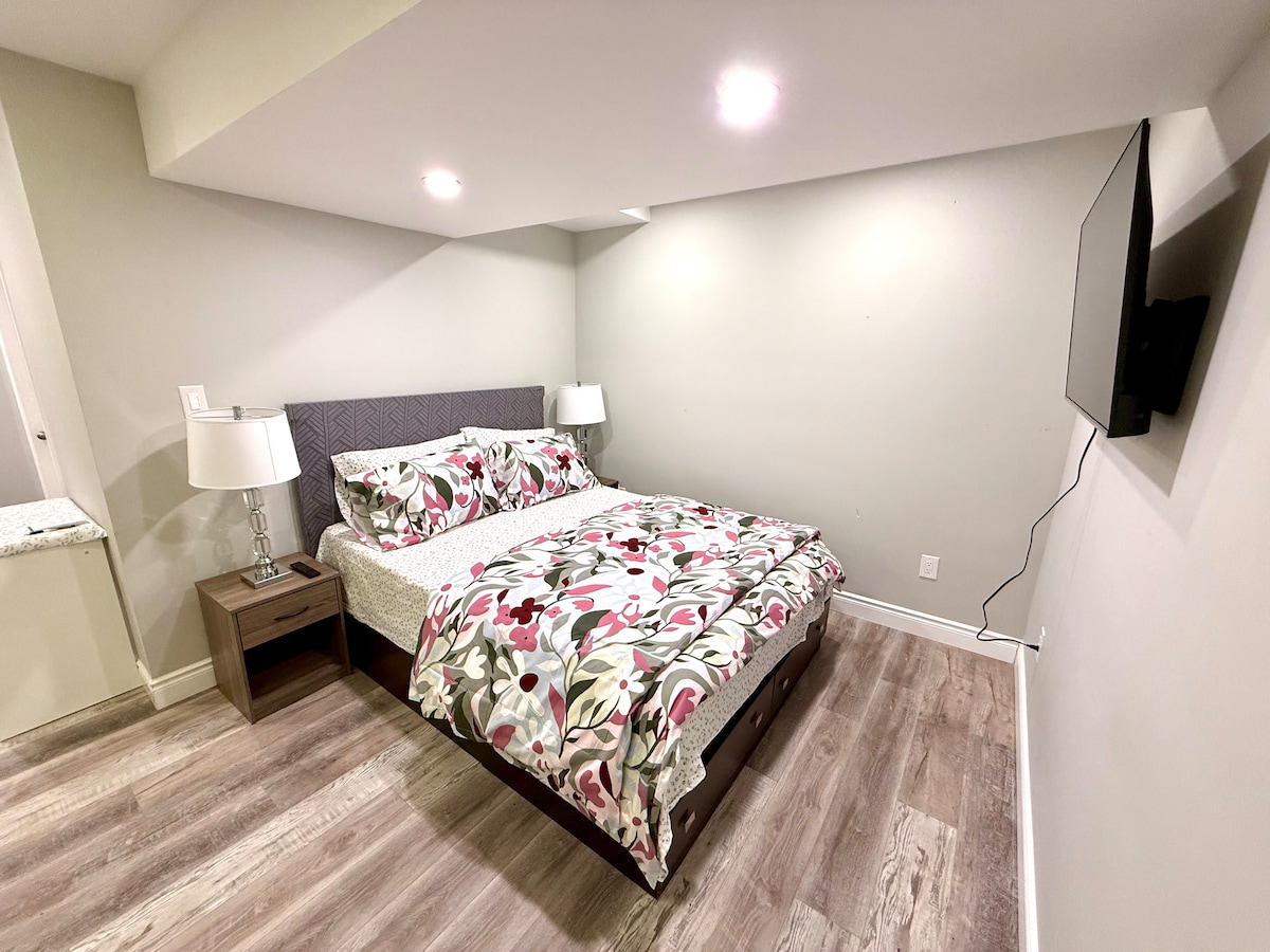 Step into my stylish 1-bedroom basement retreat. Sleep soundly on the day bed and relax in the cozy living room with a corner sofa bed. Entertainment options abound with a 50" smart Roku TV equipped with Netflix and a vintage Hi-Fi set for your favorite tunes. Enjoy the fully furnished kitchen with a dishwasher. Freshen up in the private 3-piece bathroom. Convenient amenities include a private laundry, separate entry, hi-speed internet and free parking. Book now for a modern & comfortable stay!