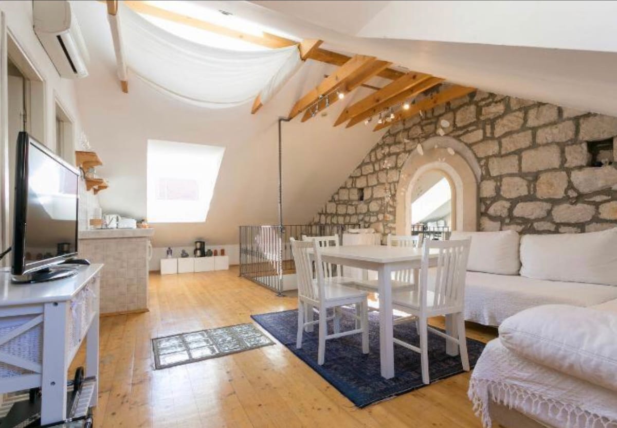 Relax in this beautiful 1913 loft! The house was lovingly built with stone, beamed ceilings, and antique elements for a grand yet charming feel. Unobstructed view of old town and endless Adriatic sea are at your fingertips. The house is situated on Ploce Gate, one of the Old Town's two main entrances. Despite the fact that we are in the heart of the city, the place feels tranquil and remote.