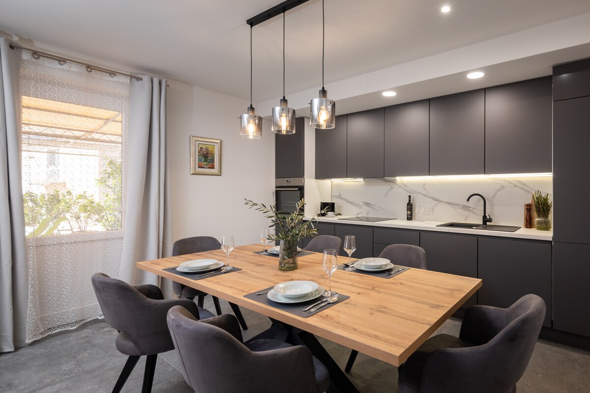 Precioso, nuevo y cómodo apartamento Felis en Duće para 4-5 personas, primera fila a la playa. Este espacioso apartamento se extiende sobre 100 metros cuadrados. Hay dos cómodos dormitorios con camas de matrimonio (180x200) y dos baños (2 cabinas de ducha, lavadora). También hay una sala de estar con un sofá extensible (164x195) y una cocina totalmente equipada con zona de comedor. El apartamento tiene balcón con mesa y sillas.