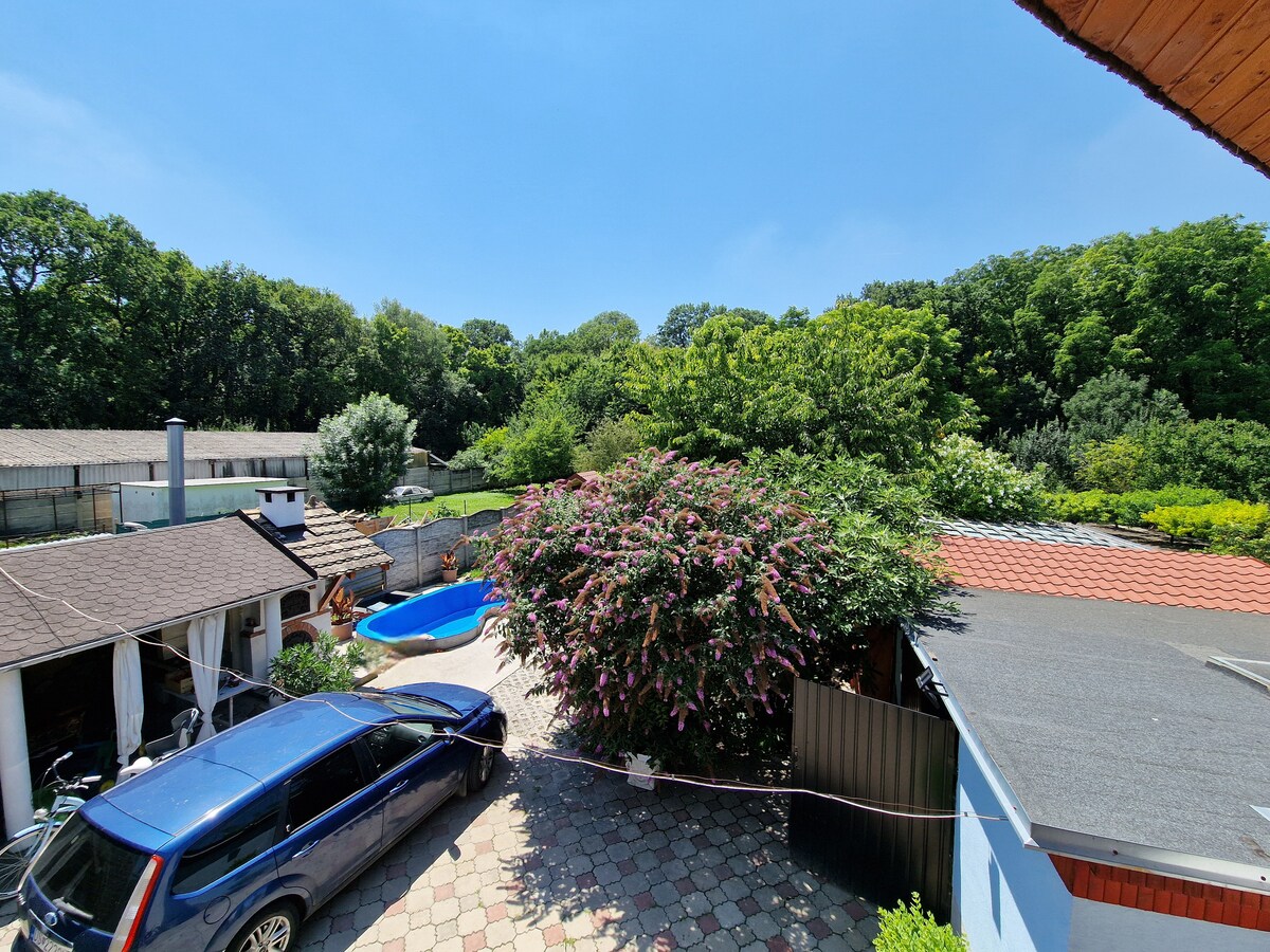 -64km from the Bratislava Airport (BTS) -There are 3 room. 2 upstairs and 1 at downstairs. -ROOM 2: This room is at the upstairs. It has 4 bed and private kitchen and bathroom with big shared balcony. -Outside there are pool and grill and large yard. There are 2 friendly dogs (Border Collie and Bichon Havanēs). -You can park inside the backyard or the street (both free) -In the town one of the biggest intrest is Thermal Corvinus. Near Town: -Bratislava (50km) -Győr(22km) -Budapest(120km)