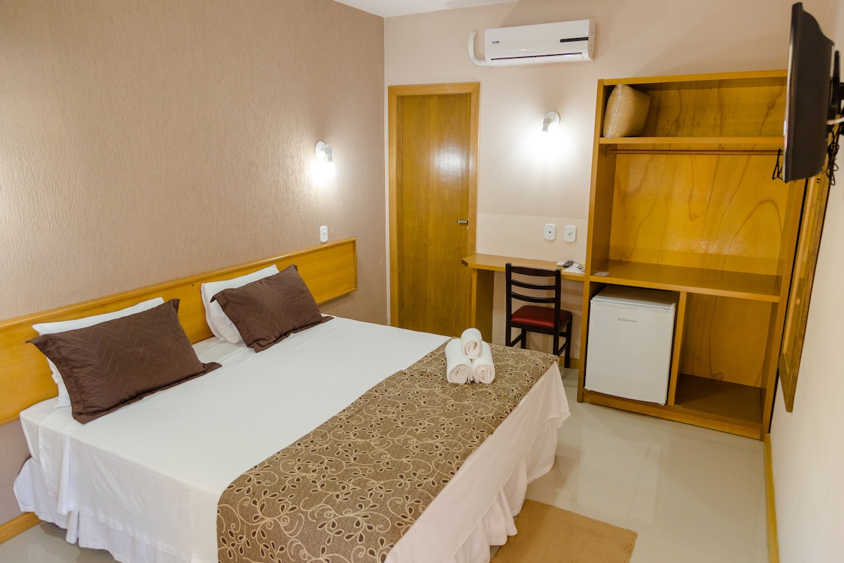 Experimenta la comodidad y la tranquilidad en nuestra suite "Pan de Azúcar". Esta espaciosa habitación ofrece una cama tamaño king para noches de descanso absoluto, además de un minibar y un mini armario para tu comodidad. La ventana del dormitorio ofrece una hermosa vista, ideal para comenzar el día con el pie derecho. Con un baño privado y todas las comodidades que necesitas, la suite “Sugar Loaf” es la opción perfecta para tu estadía en Río de Janeiro.