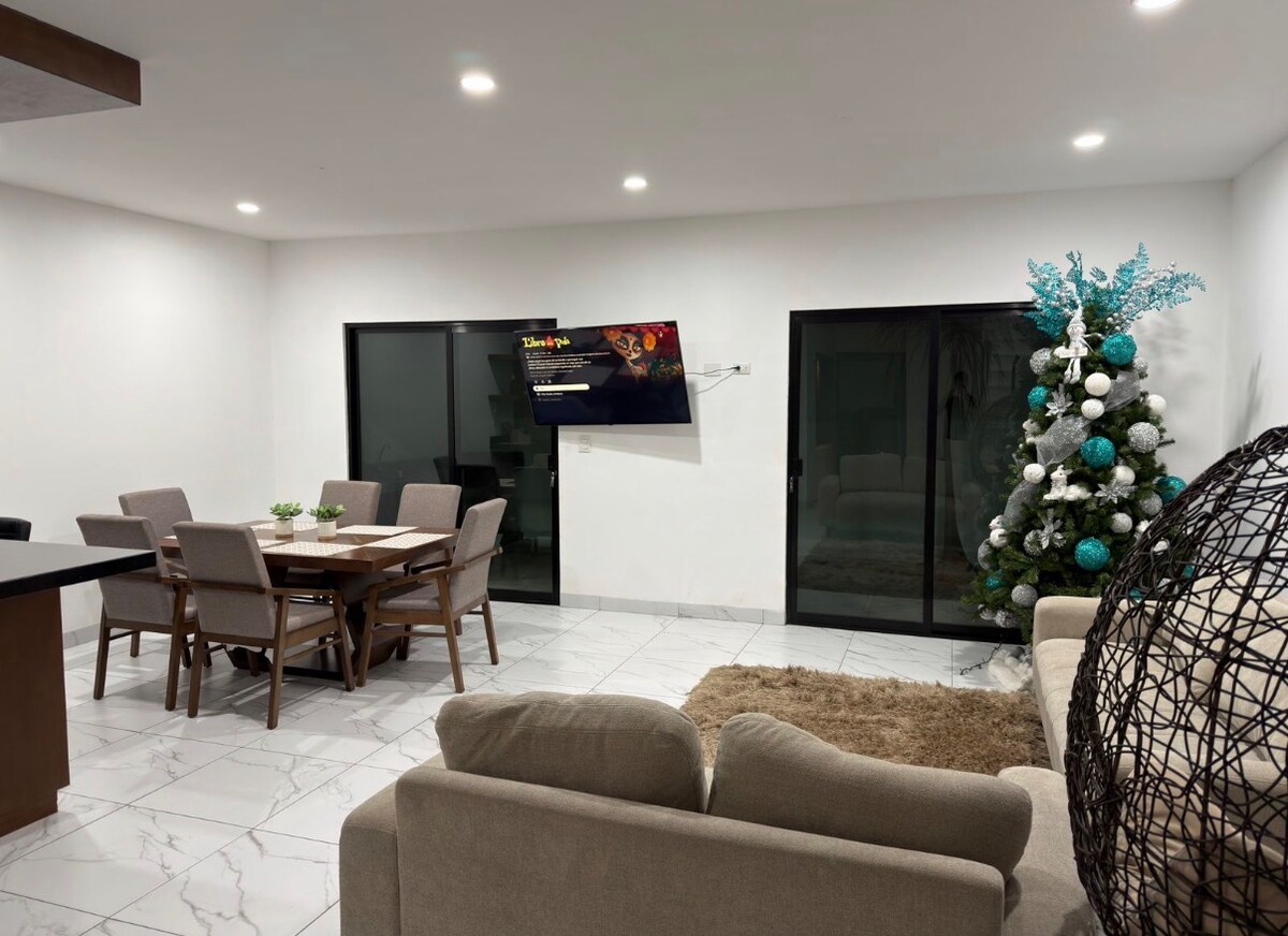 Amplia casa en residencial , ideal para descansar. Cuenta con 3 recámaras: principal con cama king, baño y vestidor; secundarias con cama queen y Smart TV. Sala, comedor, cocina equipada, lavadora, patio con asador, cochera privada y acceso autónomo. Ideal para familias, amigos o trabajo. Streaming disponible costo extra (Netflix, Prime, Disney+, Max). Se permite fumar en el patio.