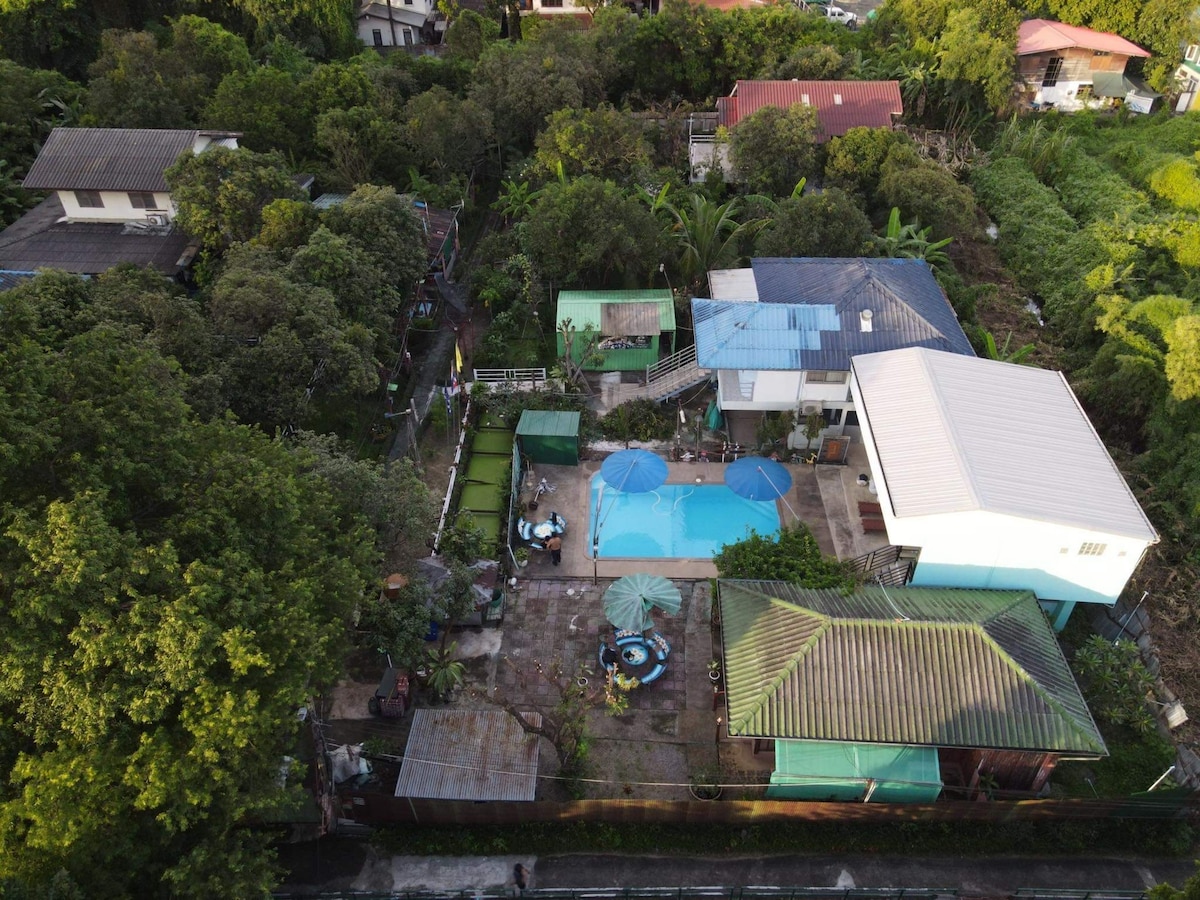 Este alojamiento se distingue por su ubicación tranquila y las instalaciones disponibles. Charlie y Raewyn son tus anfitriones en este pequeño centro vacacional familiar. Hablan tanto tailandés como inglés. Situado en una ubicación tranquila a las afueras de Bangkok, hay muchos autobuses y taxis que te llevarán al centro de la ciudad (a 14 km de distancia). Nos complace anunciar que el nuevo tren elevado Purple Line ha abierto cerca y puede conectarte con el aeropuerto (combinación tren elevado, metro y línea púrpura), así como con el corazón de la ciudad. Nuestra estación es Wong Sawang. También hay acceso al muelle de autobuses acuáticos en Nonthaburi. Estamos a poca distancia a pie de un centro comercial y una zona de comida. Los puestos de comida locales cercanos venden comida local o utiliza las instalaciones de cocina totalmente equipadas y relájate en el gran comedor/zona de entretenimiento. Otras instalaciones en el sitio incluyen una piscina, equipo de ejercicio, mesa de billar, entorno de jardín tranquilo, etc. También hay una gran lavadora automática para uso de los huéspedes. Se proporciona detergente en polvo gratuito.