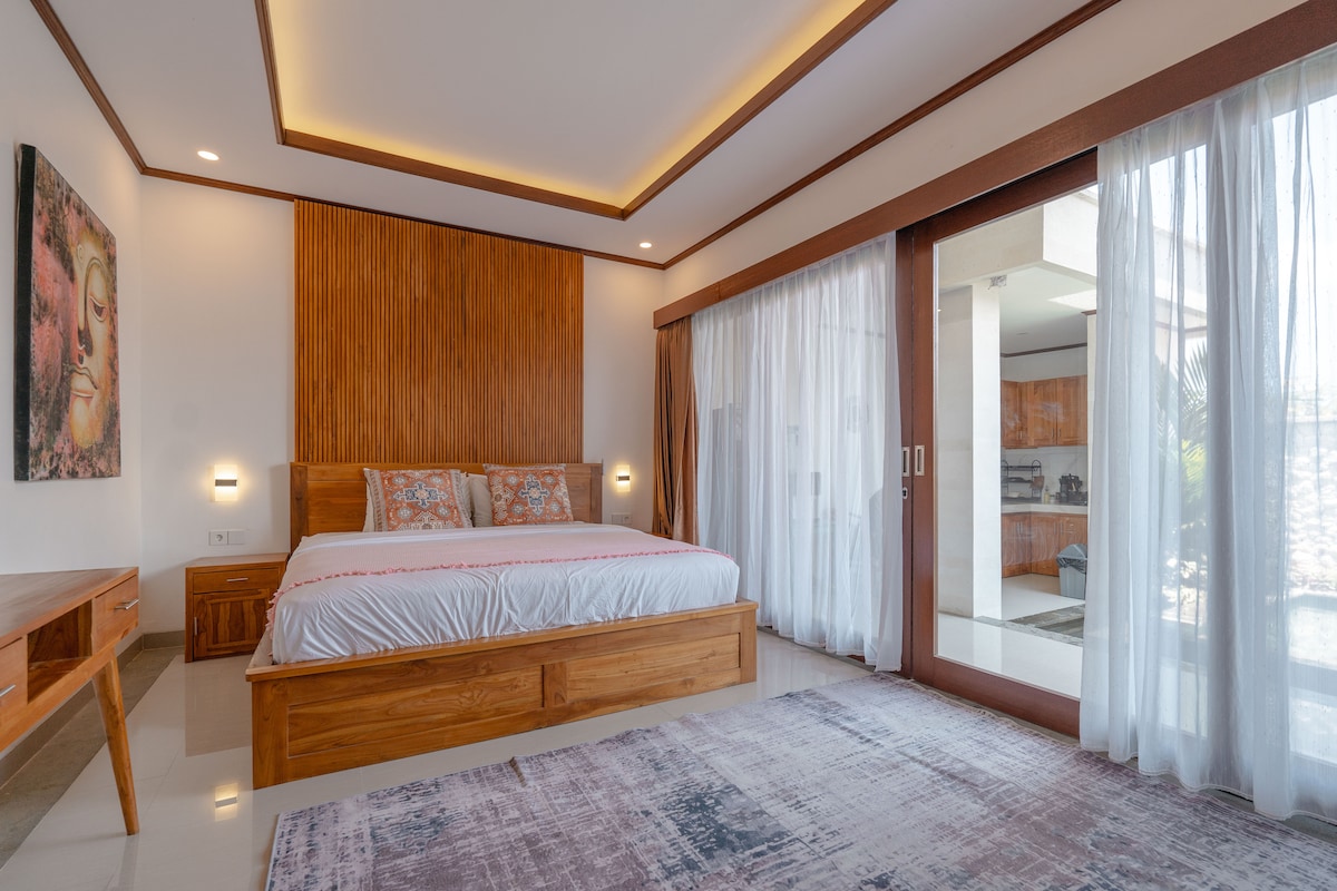 Entra y descubre una luminosa sala de estar de diseño abierto con una decoración moderna y toques balineses. Cada uno de los tres amplios dormitorios tiene su propio baño privado, lo que garantiza privacidad y relajación para todos los huéspedes. La piscina privada se encuentra en la parte delantera de la villa, invitándote a relajarte bajo el sol o disfrutar de un chapuzón nocturno después de explorar la isla.