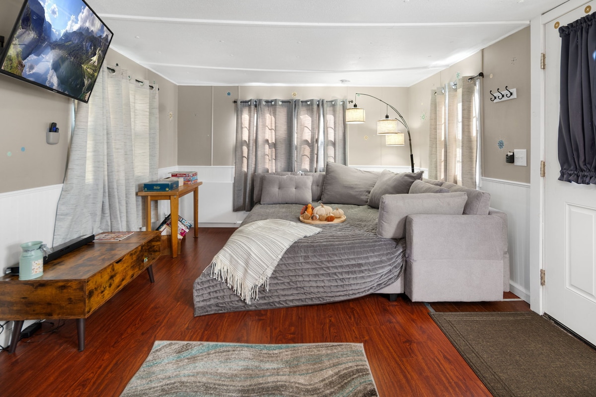 Reserva esta dulce y romántica habitación con preciosas vidrieras y una cama tamaño king. La litera inferior tiene una cama tamaño king, zona de comedor, cocina pequeña (microondas, nevera y cafetera de cápsulas) y acogedoras paredes de madera. ¡Esta habitación es la escapada perfecta para los madrugadores que quieren salir a explorar! Una enorme ventana de vidrieras da al lado este de la habitación e irradia a través de la habitación con el amanecer. Disfruta de la mañana con una variedad de cápsulas de café compostables y