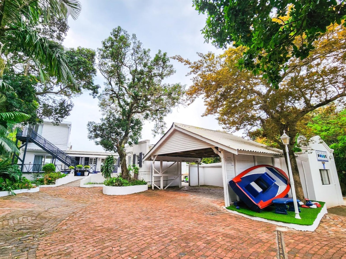 Situado en una tranquila calle arbolada en Nahoon Mouth. Nuestra casa de huéspedes de planta abierta ofrece una cama tamaño queen con ropa de cama de algodón de alta calidad, wifi sin límite, una televisión inteligente de alta definición, DSTV completo y batería de respaldo para el corte de energía. Una cocina bien equipada con fogones y horno hace que el autoservicio sea fácil. Para aquellos que disfrutan caminando y corriendo, estamos a 2 km del río Nahoon y la playa. Spar y una selección de excelentes restaurantes y cafeterías también están a un corto paseo.