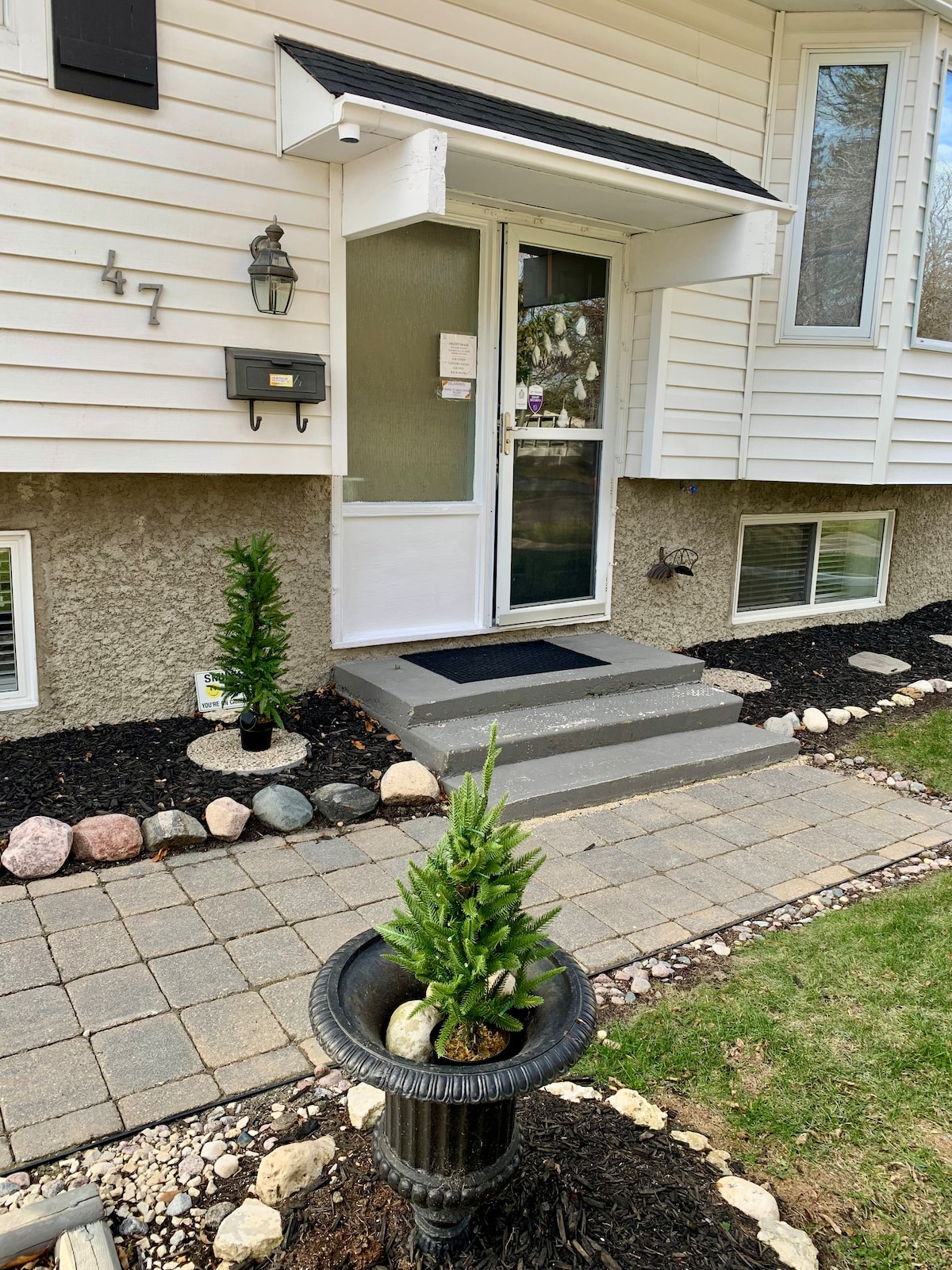 ¡Esta joya está ubicada tranquilamente en una bahía cerca de un parque a 12-15 minutos del centro de la ciudad! Entra por la puerta principal con tu código inteligente. Tu suite privada de invitados es todo el nivel inferior. Nuestra familia vive arriba. Disfruta de tu propio dormitorio privado, baño completo, sala de estar, área de oficina, lavadero y cocina. La suite tiene capacidad para un máximo de 6 huéspedes. Nota: Nuestro gato vive arriba, pero no visita la suite. No reserves si fumas o vapeas o planeas usar la puerta principal varias veces por la noche, ya que puedes molestar a los demás.